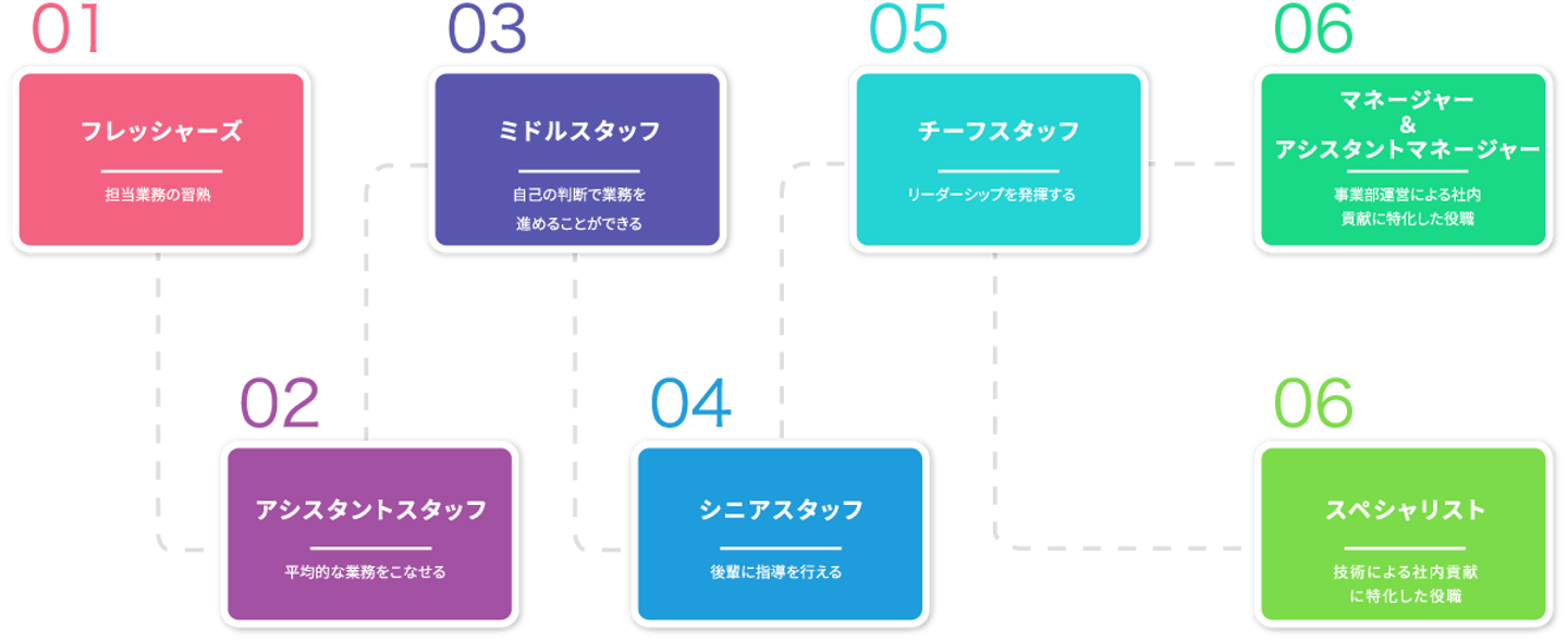 新卒で入社した場合は『フレッシャーズ』から始まり、平均的な業務をこなせるようになると『アシスタントスタッフ』へとグレードがアップ!