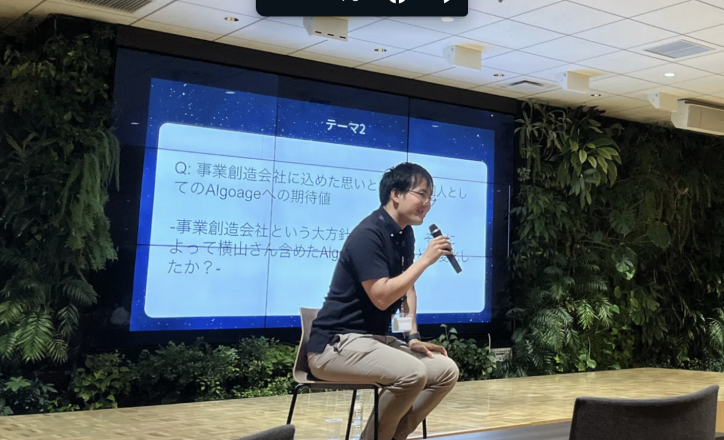 当日は代表の横山が登壇。参加者の皆さまに向けて、CEOとして、そしてひとりの事業家として、Algoageの進化と“事業創造会社”として目指す未来の姿、そして自身のキャリアの変化について、ファシリテーターとの対話形式でありのままに語りました。