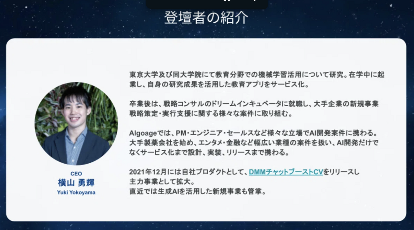 ・インタビューなどで読んでいたAlgoageの話を、横山さんから直接聞けた(ので非常に満足)。 また、横山さんのソフトな部分も聞けて、人間的な魅力も感じられました
