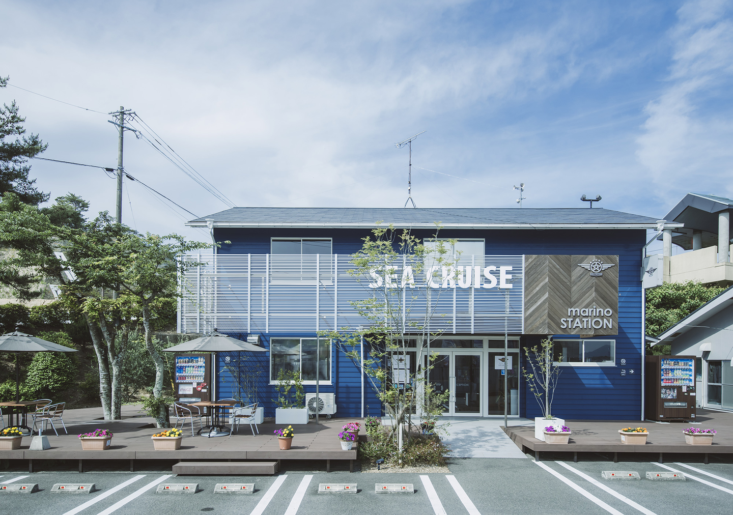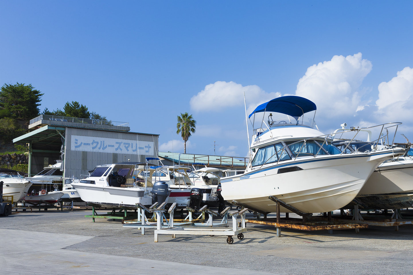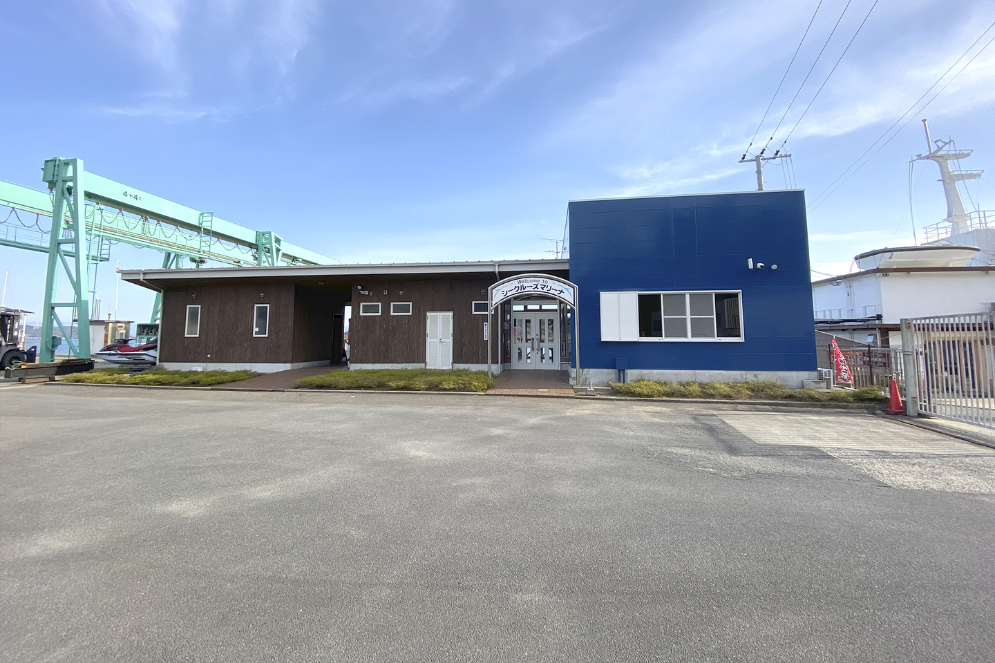 本社社屋、ナビオの2施設に”カリフォルニアブルー”がシークルーズのコーポレートカラーとして認知され始めた効果は大きく、片方の施設を訪れたことがある方はすぐにもう一方を当社の施設として認識していただけるようになった。また、この2施設のデザインにひかれて入社希望をしてくれる若者も増加する結果に。そんな中、当社で1箇所だけ別のカラーのまま残っていた施設がある。それはシークルーズマリーナ。観光色が強い本社及びナビオと違い、ボート免許やクルーザーの保管・販売をする部門。しかし、以前からカラーを統一した方が良いと思っていた中で今月、マリーナもカリフォルニアブルーに改装。
