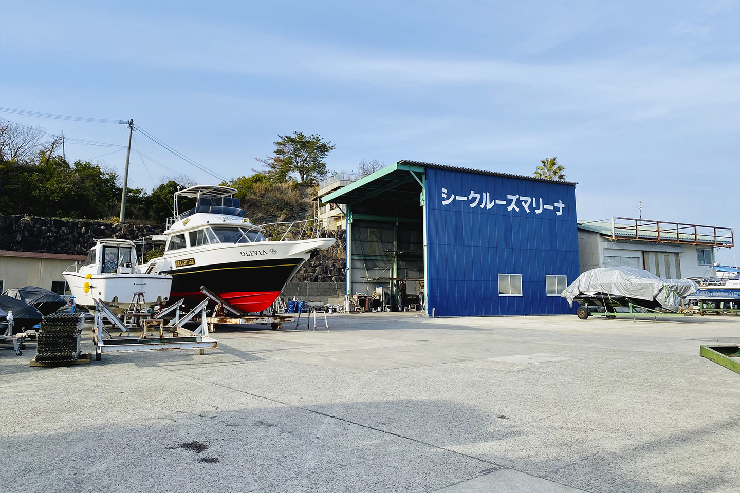 まだサイン関係の工事が終わっていないので少し殺風景だが、これでマリーナも同じカラーにすることができた。今回はクラブハウスだけでなく整備工場もカリフォルニアブルーに。マリーナでボートを保管頂いているオーナー様からも「シークルーズらしい色だね。」「本社やホテルと同じ色にしたんだ。」など既にオーナー様にも当社のカラーだと認識して頂いていることがわかった。