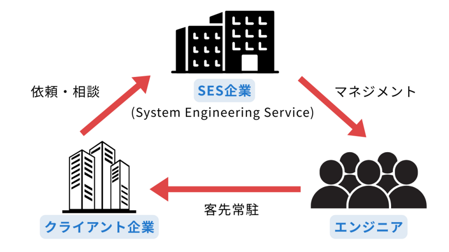 SES(システムエンジニアリングサービス)は、エンジニアがクライアント先で業務を行うスタイル。
