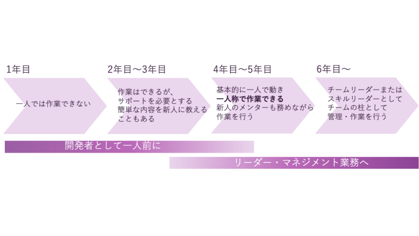 開発スキルが身についた後は、マネジメントやリーダー業務にもチャレンジできる環境が用意されています。