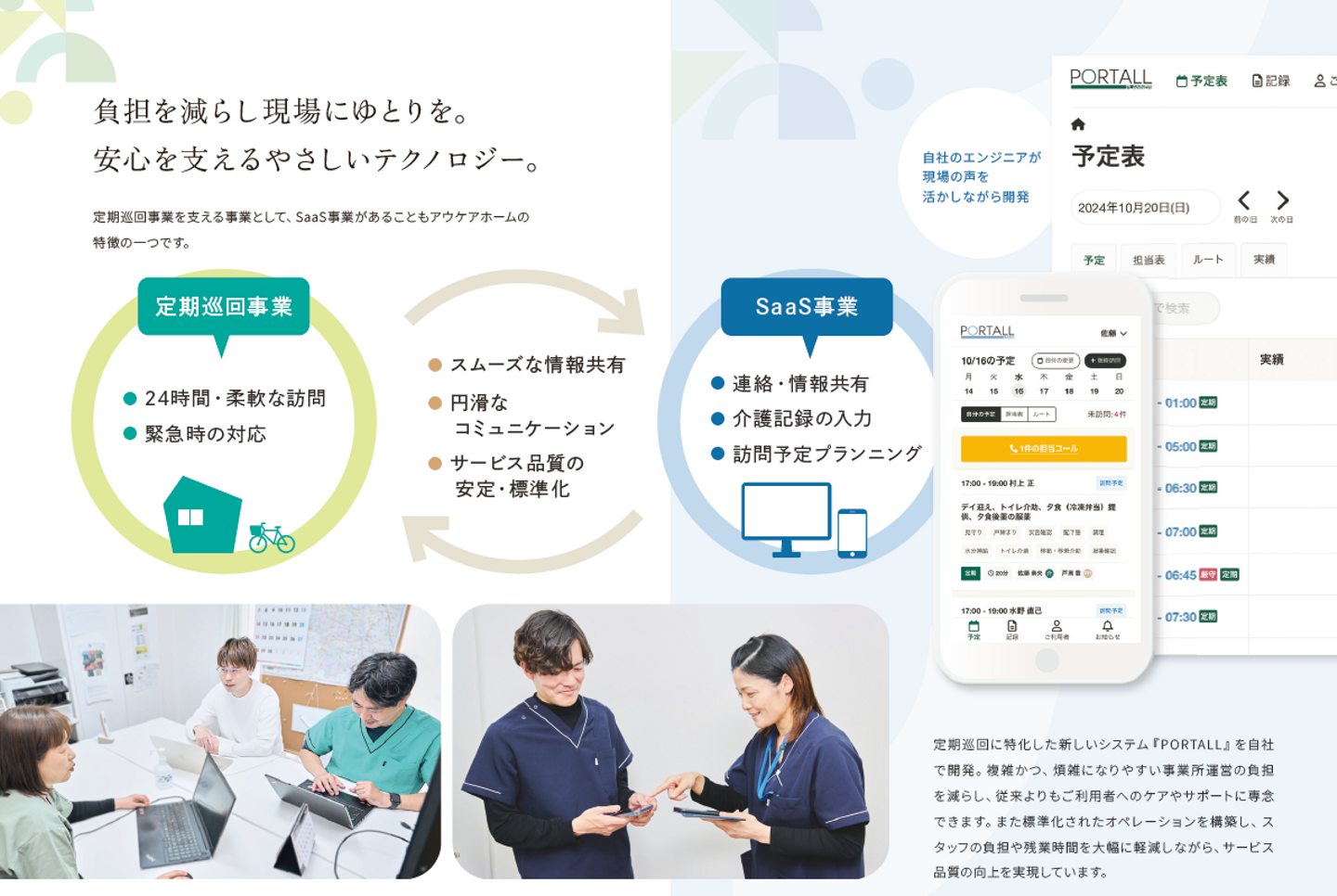 私たちは、定期巡回型の在宅介護サービスを展開しながら、介護現場の負担を軽減するSaaS『PORTALL(ポータル)』を自社で開発しています。