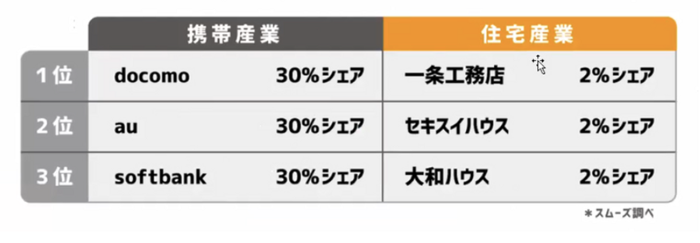携帯電話会社として、思いつく会社を3つ挙げてみてください。おそらくほとんどの人が同じ3社を挙げたのではないでしょうか。そして実際にその3社で業界の8~9割のシェアを寡占している状態です。