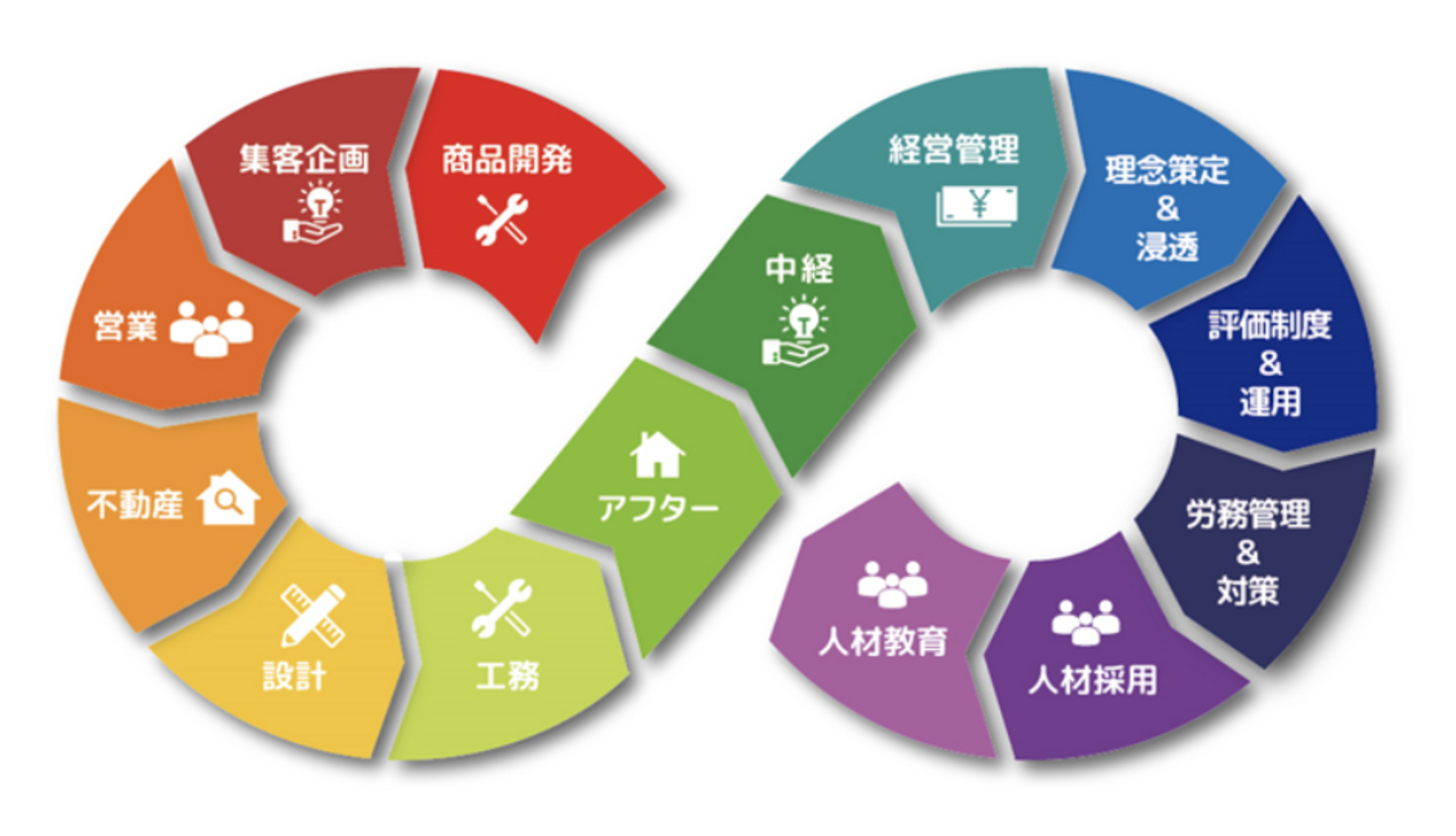 住宅産業はこのバリューチェーンが他の業界と比べて長いことも特徴です。商品開発から実際のお客様の手に渡るまでの間だけでも、たくさんの部門と人が関わっています。