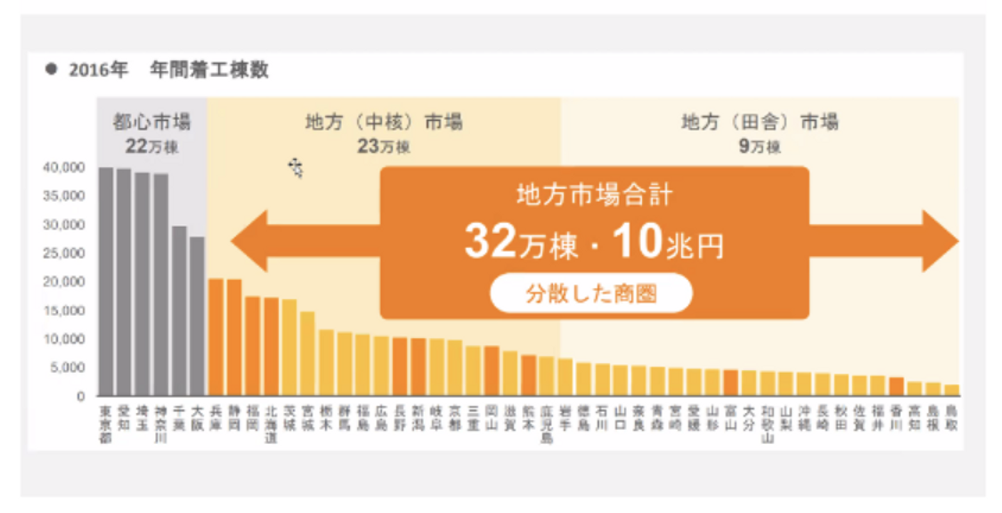 当たり前の話ですが、家は、どこに住んでいても必要なものです。住宅産業は都市一極集中ではなく、地方にも商圏が分散し、大きな可能性が眠っています。地方(中核)市場と田舎の市場を合わせると、32万棟・10兆円もの商圏(※1)が見えてきます。マーケットが分散しているということも、他の産業とは違った特徴です。