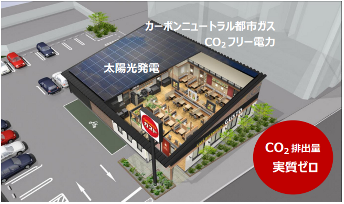 8/11にオープンしたガスト東村山市役所前店は、環境への配慮を大切にし、持続可能なエネルギーを活用する店舗。太陽光発電設備やCO₂フリー電力の導入により、お店の電力は100%再生可能エネルギーでまかなわれます。
