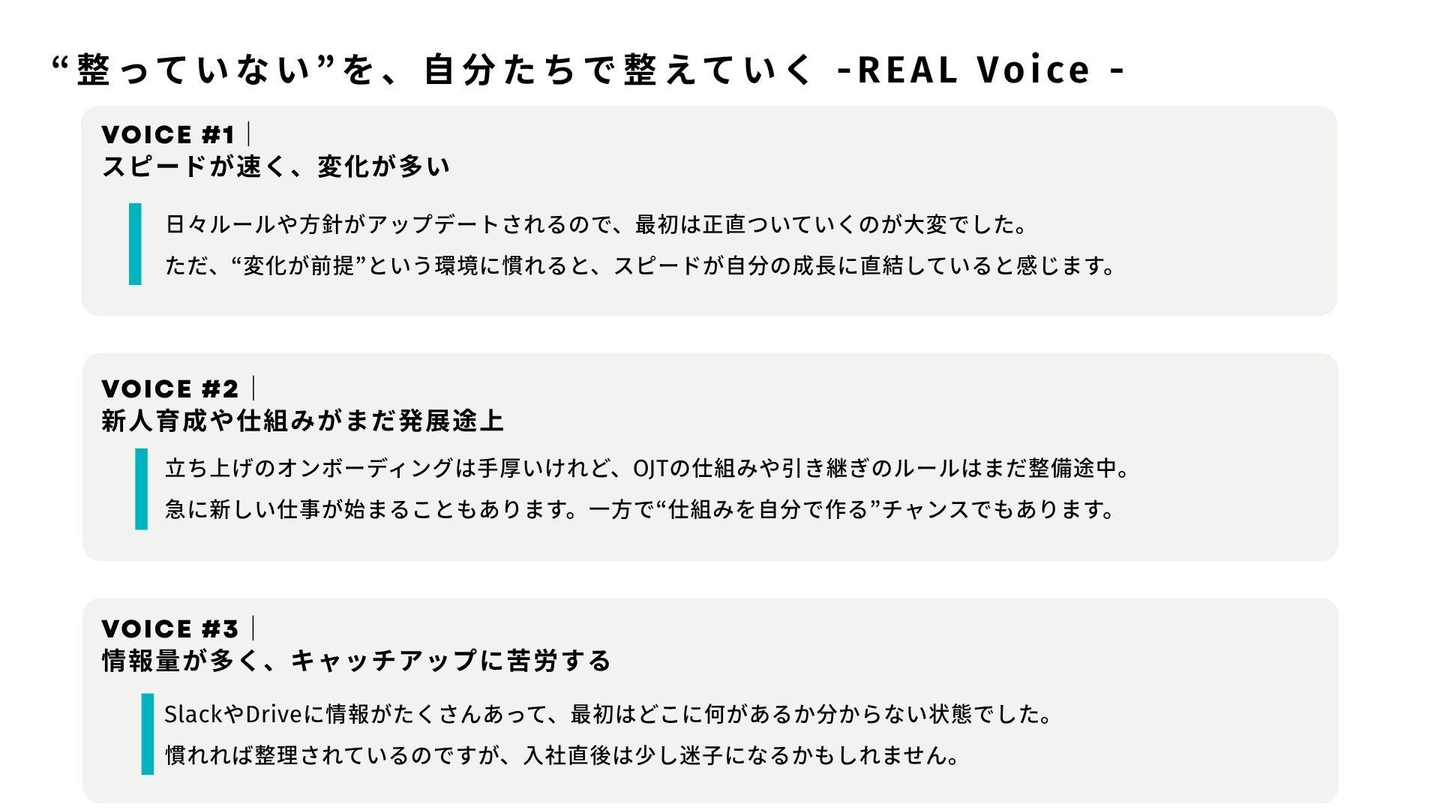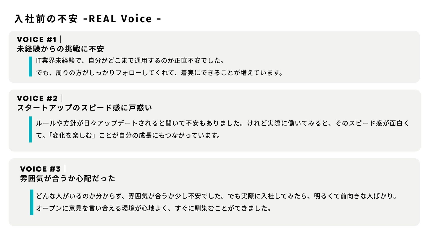 スタートアップという未整備な環境に、不安を抱いていた人も少なくありません。「どんな人が働いているのか」「スピードについていけるか」「制度や仕組みは整っているのか」など、声はさまざまでした。