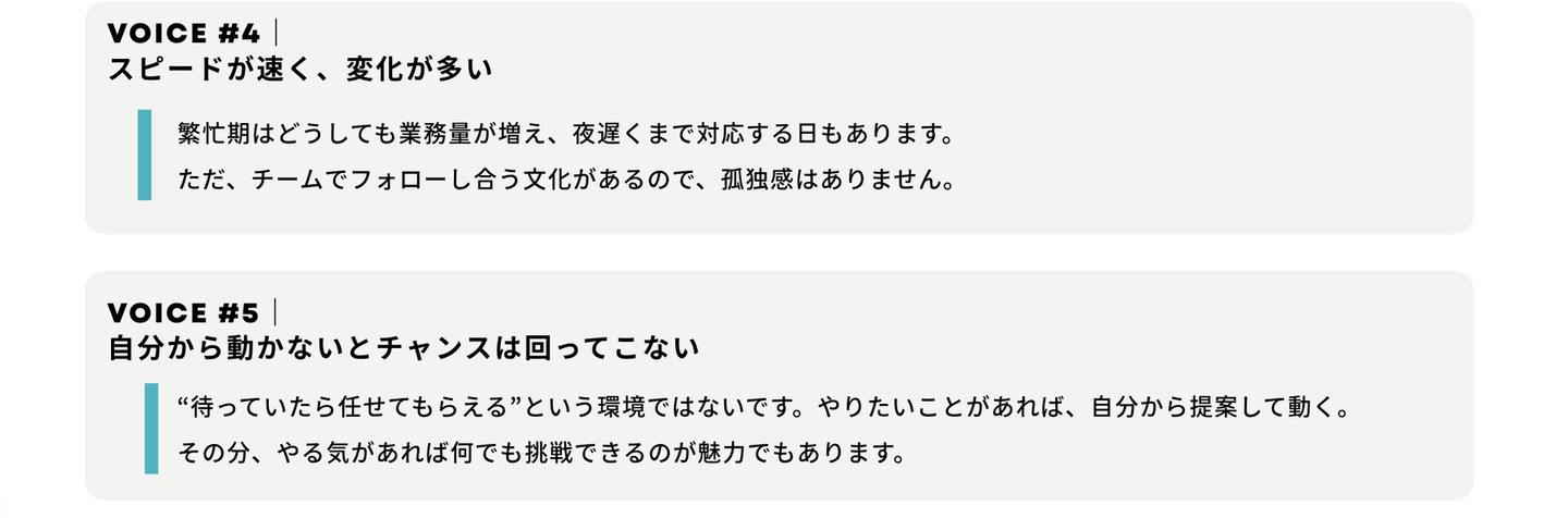 入社後、想像以上のスピード感と裁量に驚く声が多数。「聞いていた以上に、挑戦できる」「自分の提案がすぐに動く」そんな、手触り感のある成長実感が日々の原動力になっています。