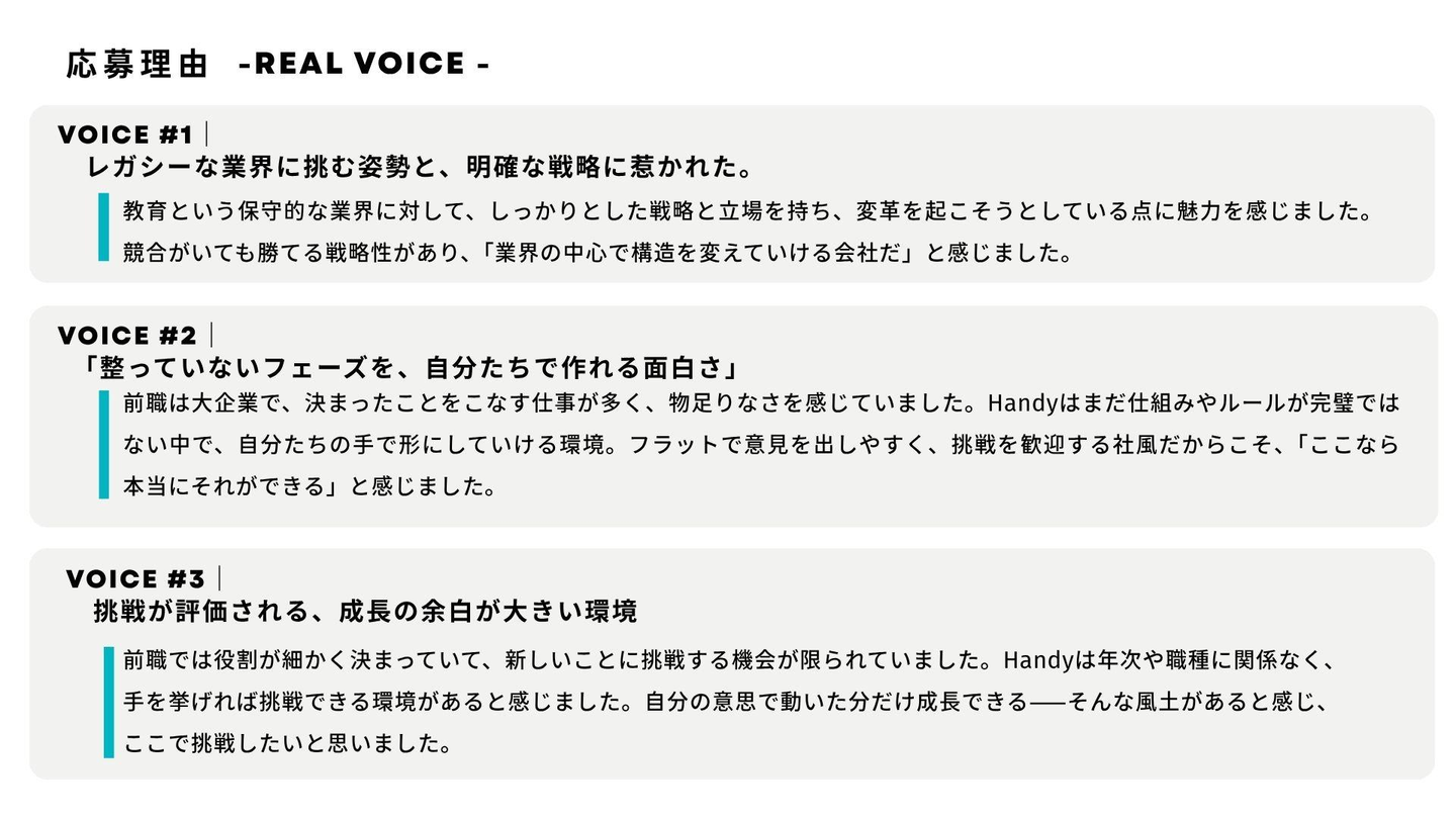 意義のあるサービス × 自分を成長させるフィールドが両立する場所を求めて、ハンディを選んだメンバーが多くいます。