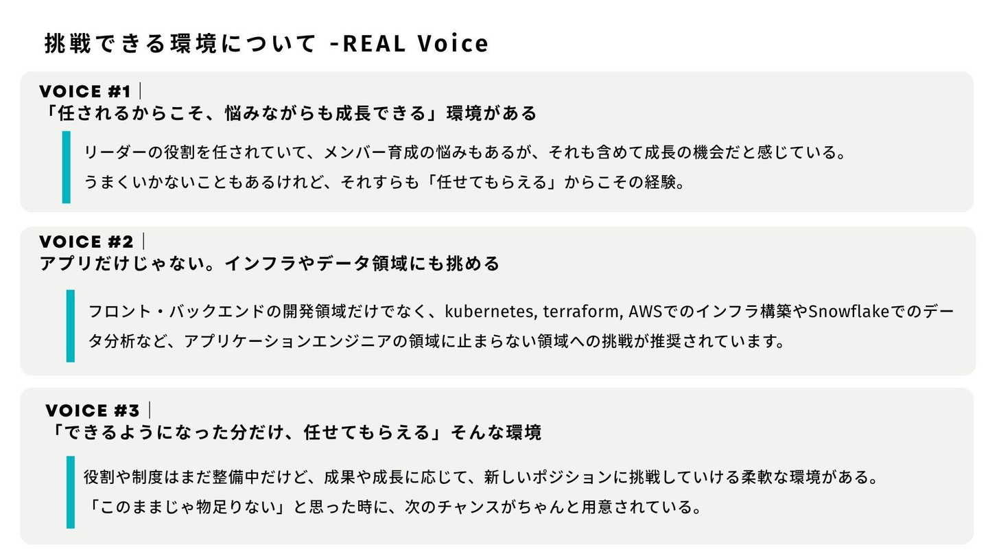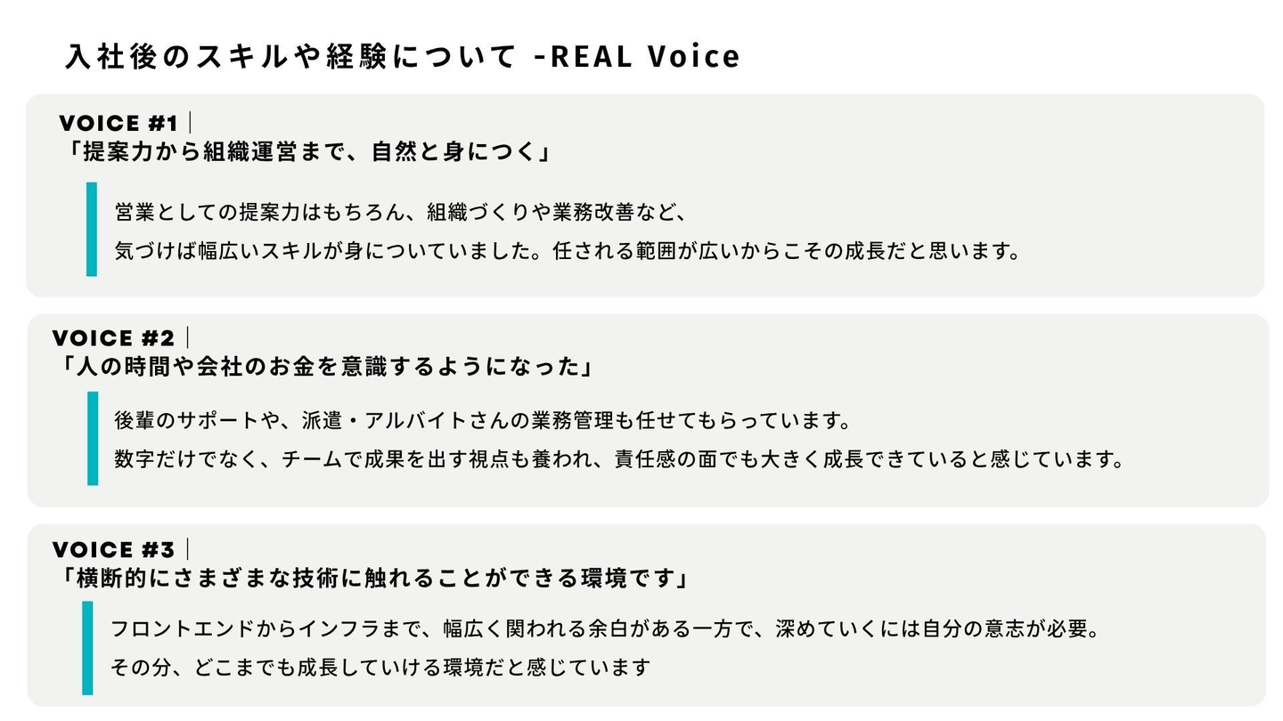 前編─に続いて、後編では、実際に働いて感じたスキルアップや挑戦環境、向いている人などを社員の声とともにお届けします!