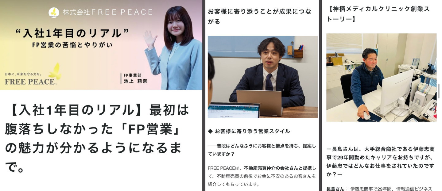 社長/社員インタビュー記事執筆:現場のリアルな声、失敗談、創業秘話、経営哲学などを深掘り、メディア記事として発信します。エージェントやその他説明会にも引用することでさまざまな採用チャネルでの成果向上に繋げることもできます。