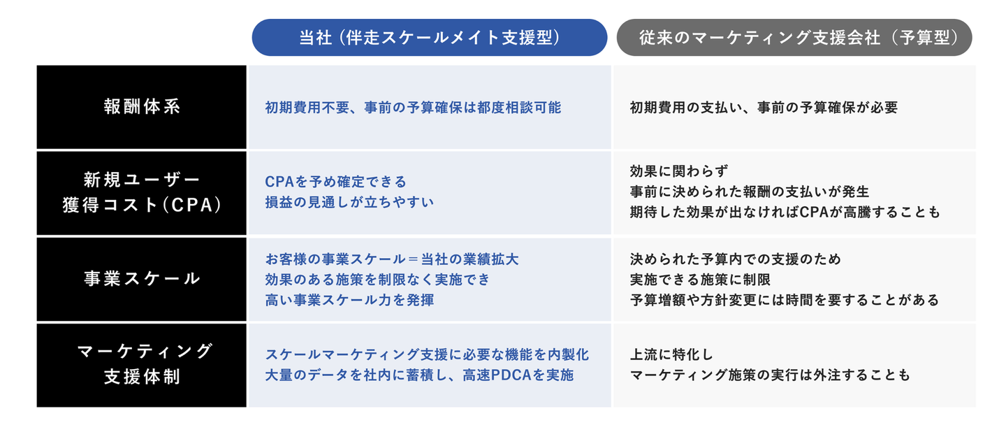スケールメイトの特徴のひとつは、クライアントさまの事業成果に連動する、独自の「伴走スケール支援」モデルを採用していることです。