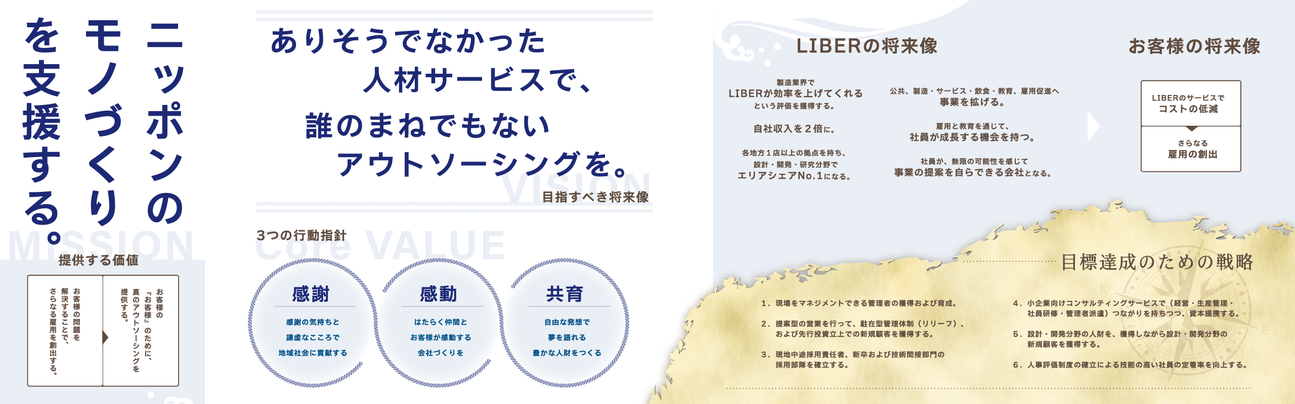 「誰のまねでもないアウトソーシングをつくりたい。」 そうした想いから、LIBERは誕生しました。 これまでの人材サービスは、即戦力を表面上で求めるあまり、 働く人の成長や、企業の本質的な課題解決が置き去りにされがちでした。 「感謝」「感動」「共育」を軸に、人と企業の“あり方”そのものを変えていく。 そんな信念のもと、自由な発想を大切にし、 現場から社会を変える仕組みづくりに挑戦しています。 働く人・企業・地域社会が、 共に育ち合える循環の中心となる存在を目指しています。