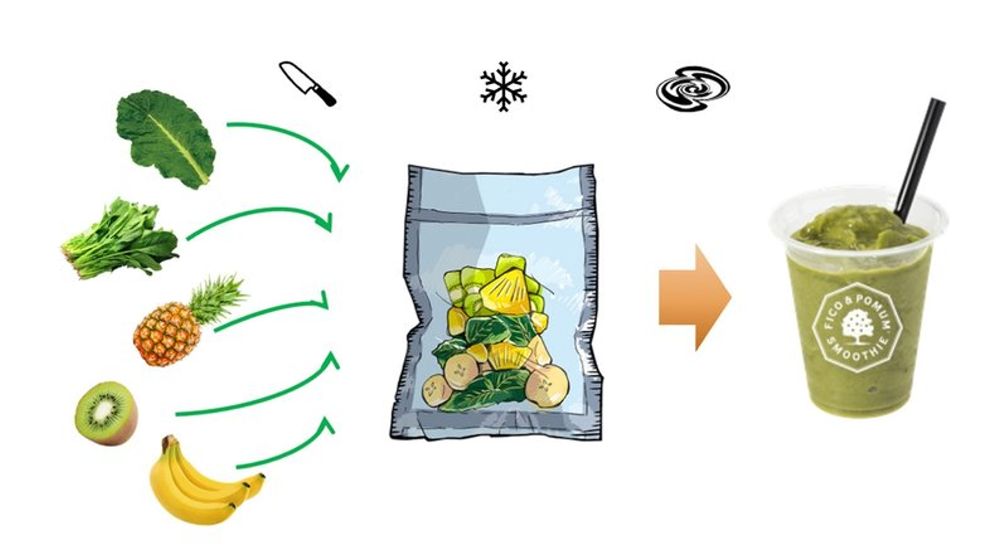 「食材のロスをなくす」ために実店舗の現場の知恵から生まれた、スムージーに必要な食材がちょうど1杯分になった冷凍パックです。