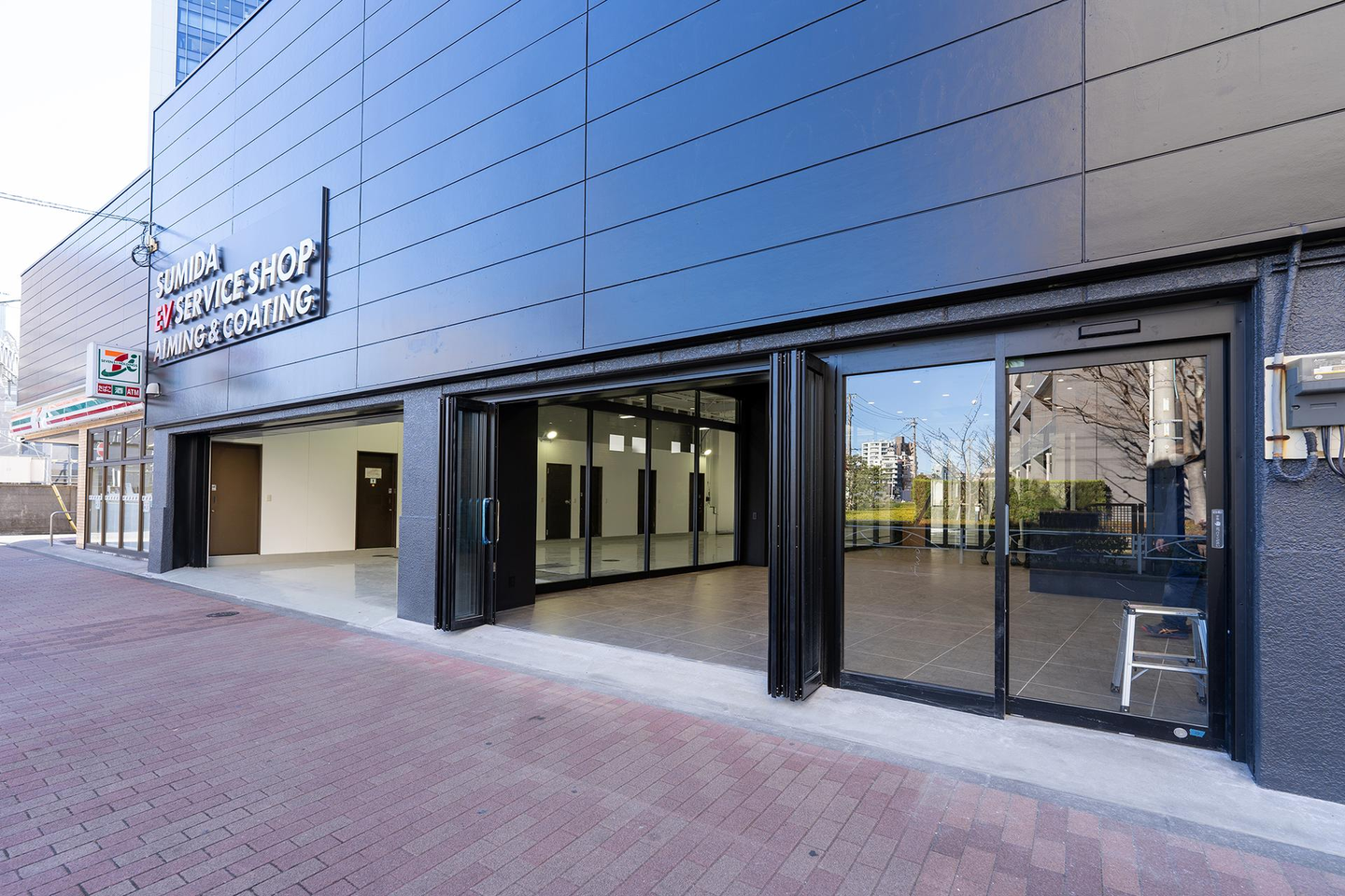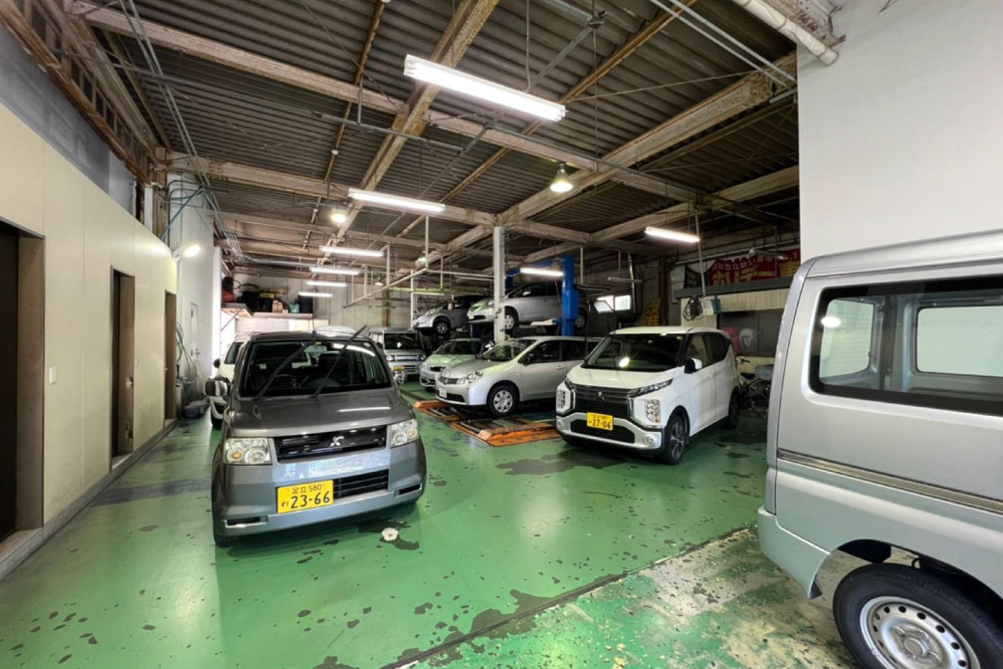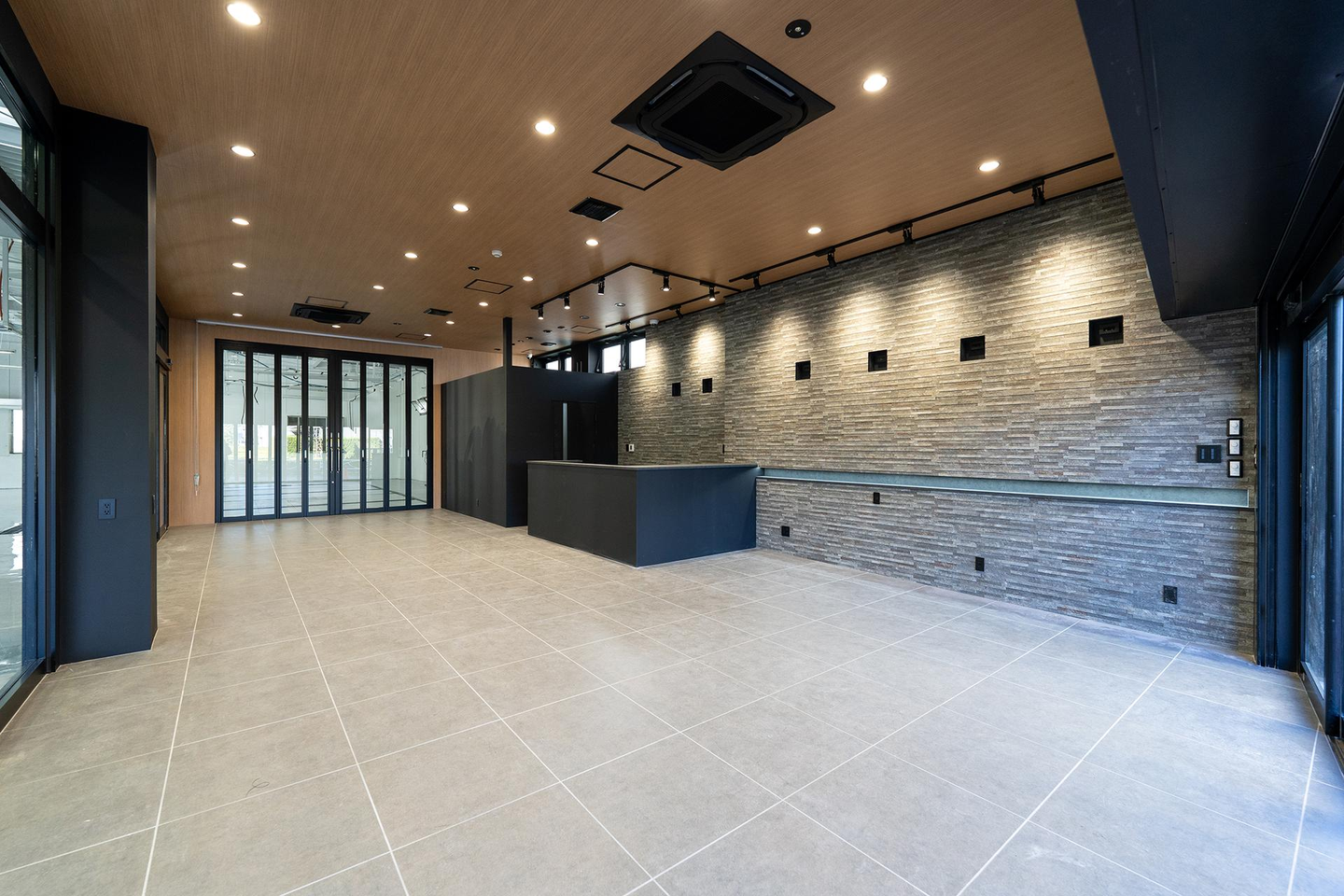 車2台分の展示も出来るショールームスペース・設備エリアは全て塗替え、外壁・屋根も塗装工事をさせて頂きました。