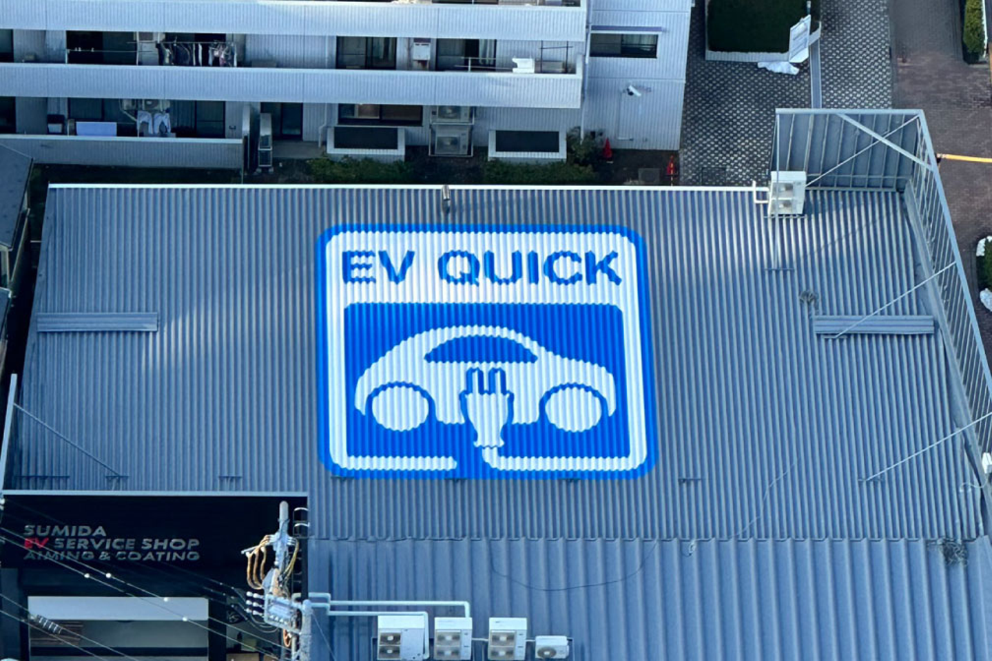 EV充電スタンドを視認しやすくする為に屋根にロゴをペイントさせていただきました。