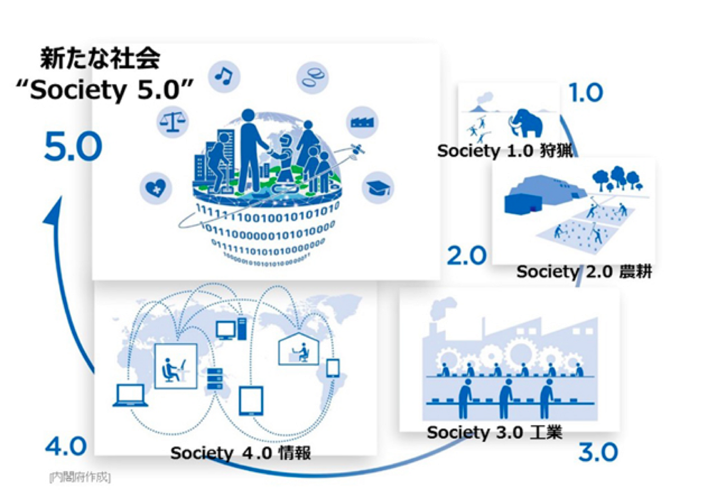 これまで社会は、自然と共生した狩猟社会(Society 1.0)、集団を形成し組織をつくるようになった農耕社会(Society 2.0)、残業革命により生産活動が進んだ工業社会(Society 3.0)、インターネットの普及により築き上げた現在の、情報社会(Society 4.0)へと発展してきました。