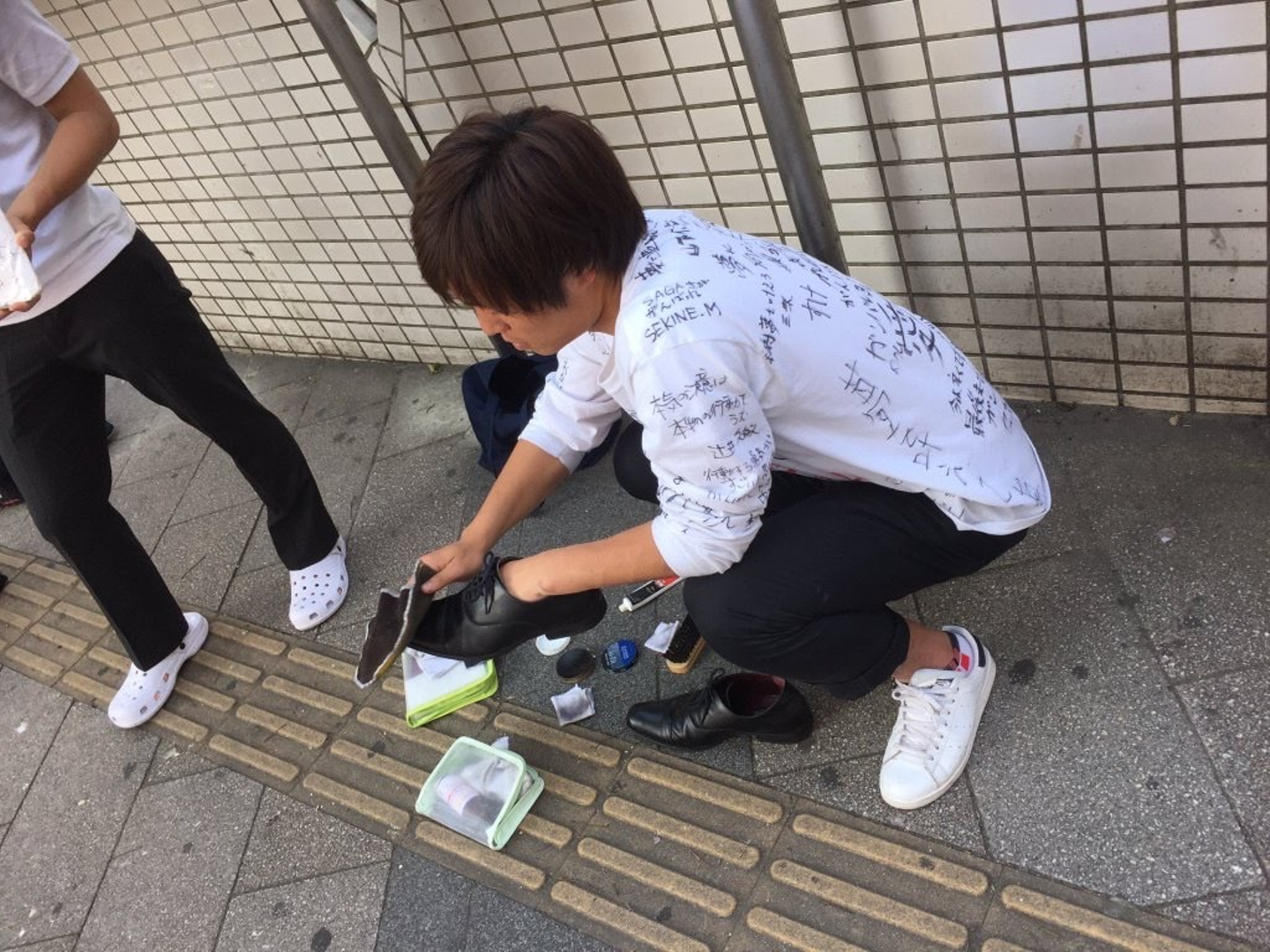激落ちくんを用意してソールをきれいにして、満足度をたかめて規定の金額よりも多くお金をいただけるような工夫をしてみたり。靴を磨いてくれた人にはTシャツにメッセージを書いてもらってました。