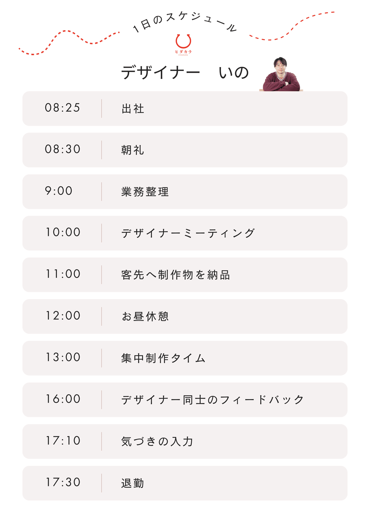 そんなヒダカラのデザイナーがどんな日々を過ごしているのかをご紹介すべく、今回は、デザイナー歴18年のいのさんの1日を追いました。