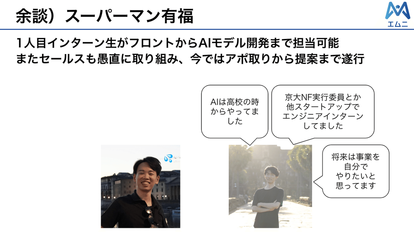 その中でエンジニアであったりセールスの力をつけることができ、圧倒的に打席に立てるインターン先というのは、エムニで働く大きなメリットなのかなと思っています。お給料をもらいながらこれだけ経験ができ、成長できる機会っていうのはかなり貴重なんじゃないでしょうか。