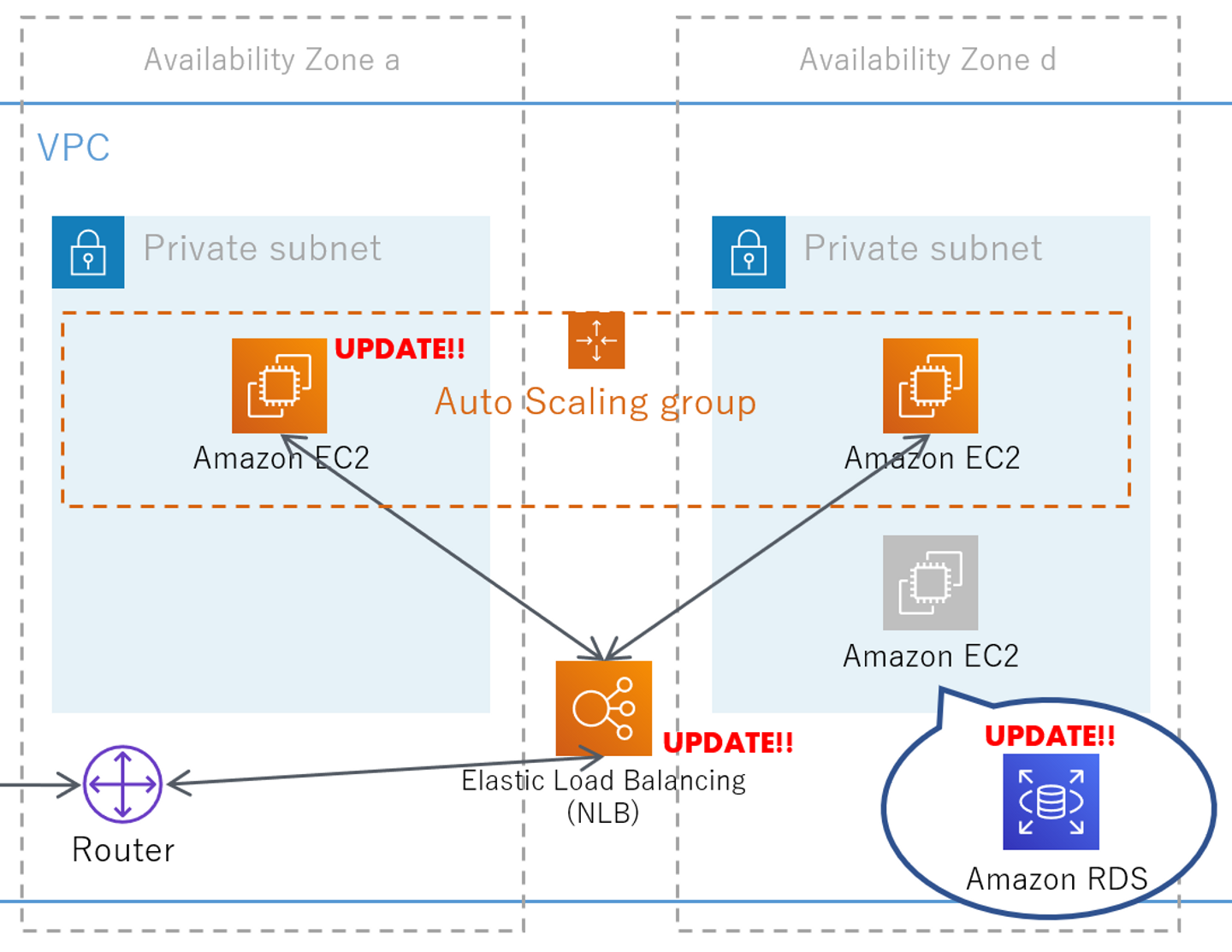 再構築プロジェクトのチームでは、高可用性を確保するためにプライベートサブネットに設置された EC2 インスタンスをネットワーク・ロードバランサーでロードバランシングし、高負荷時にスケールアウトする構成にできないか調査することにしました。そして、RDSは Multi-Az構成にして有事の際には自動で別アベイラビリティゾーンの RDS インスタンスにフェイルオーバーする仕組みを導入しようと考えました。