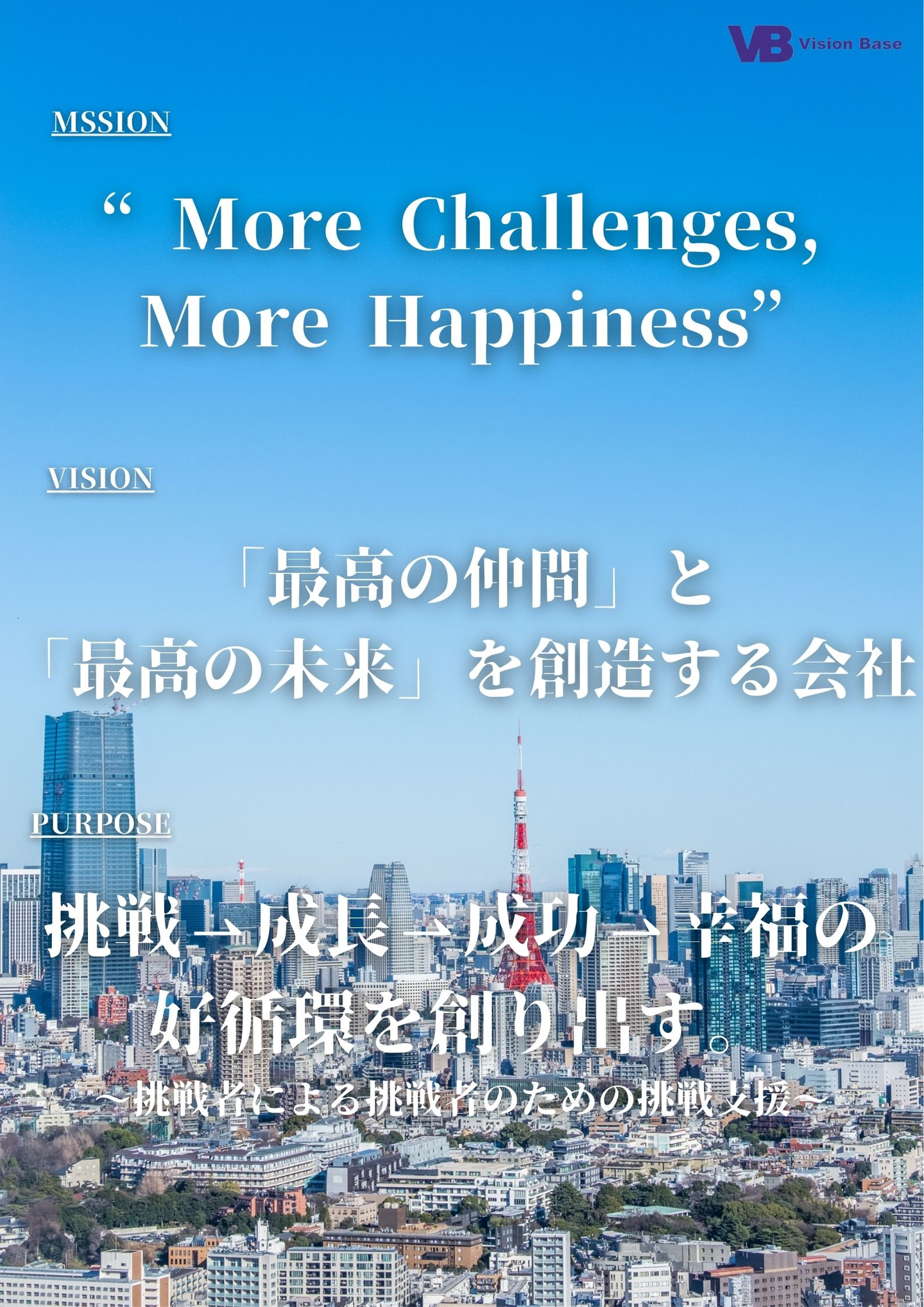 「挑戦する人を応援したい」「自分自身も挑戦し続けたい」――そんな想いを抱くあなたにとって、Vision Base は最高の舞台です。PURPOSE を胸に、新たな挑戦の波を一緒に起こしましょう。