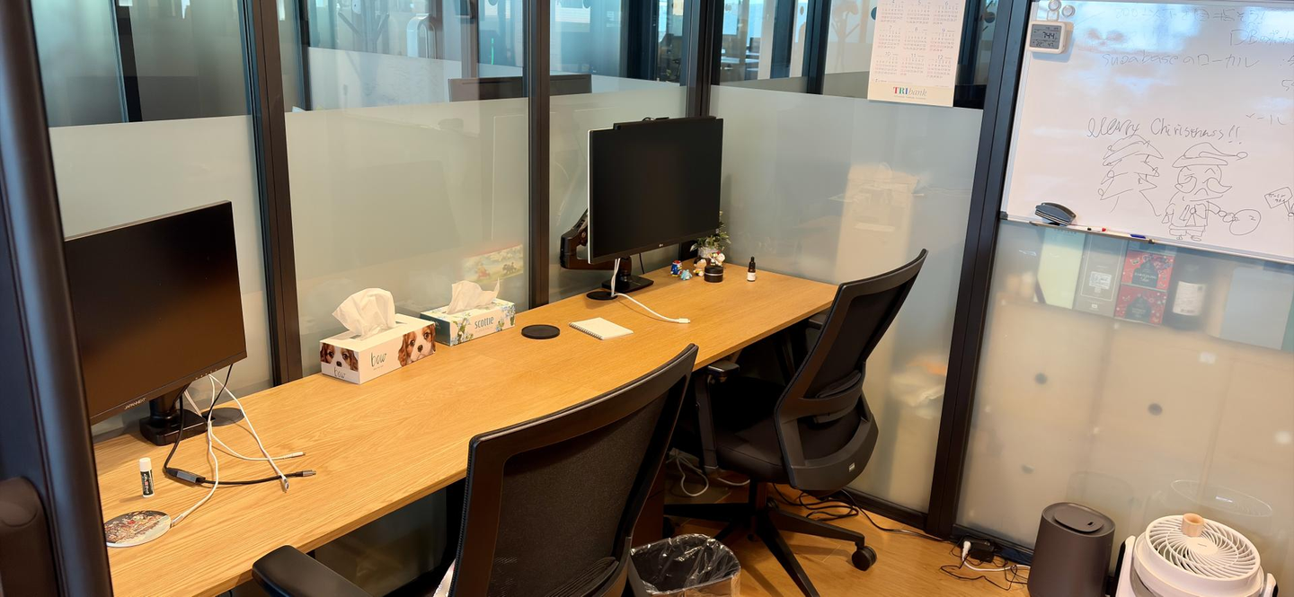 普段はワイワイしてますが、たまには「一人になりたい」って時もありますよね(笑)。 そんな時は、共用スペースの広い机を独占して作業してます。 周りの声がBGMくらいに感じる距離感で、自分の世界に引きこもれる。 「みんなと働く楽しさ」と「一人の気楽さ」、どっちも確保できるのがこのオフィスの良いところです。