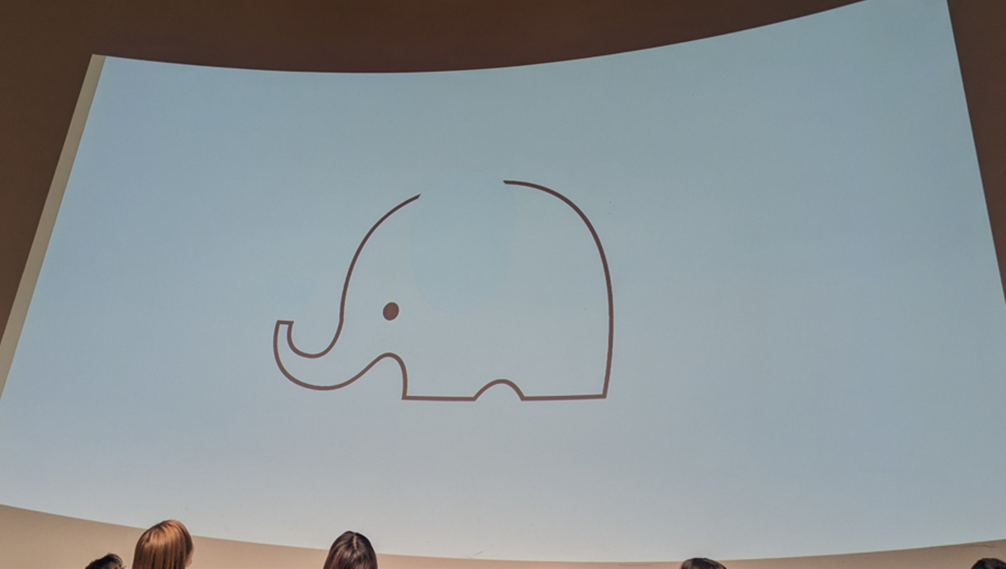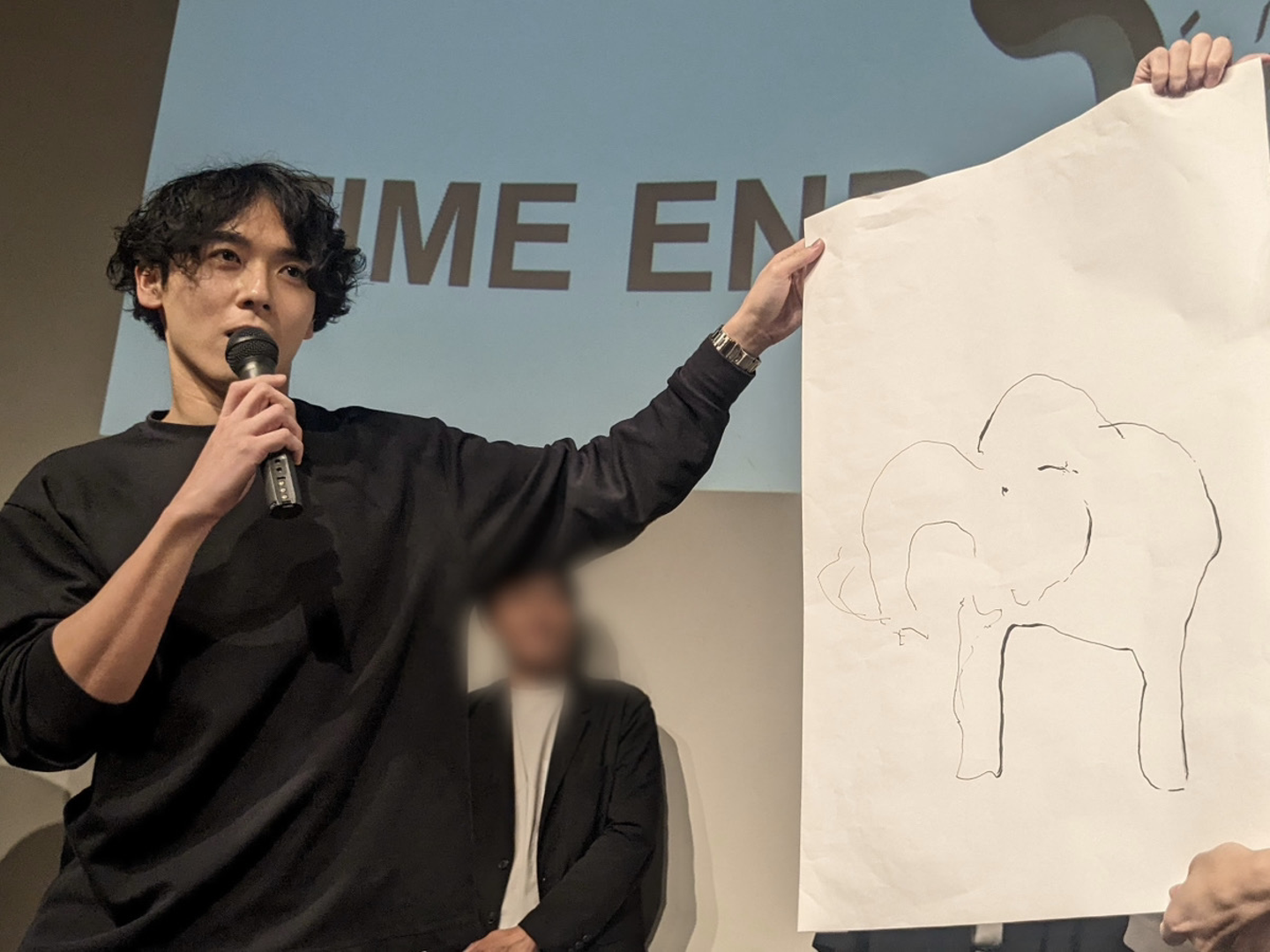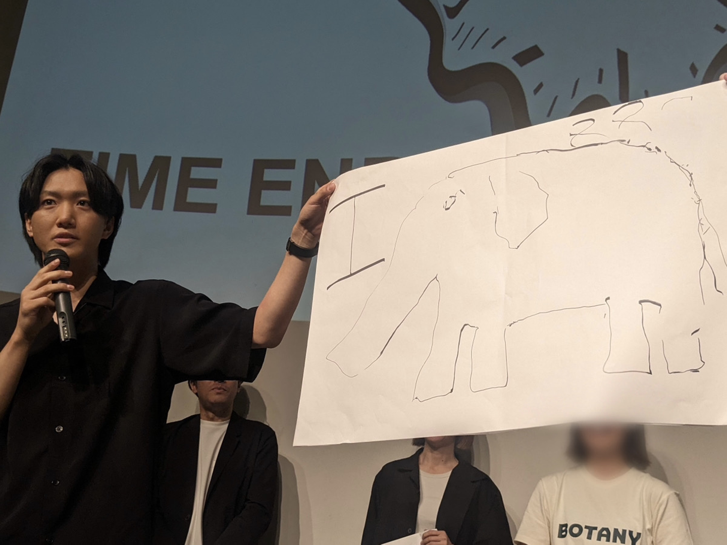 グループワークでは、TEAM DRAWINGを行いました!TEAM DRAWINGとは、写真のように紐が括りつけられたペンを使い、チームで力を合わせて指定されたお題を描いていくゲームです。二回戦実施され、お題は「アンパンマン」と、当社のブランド"mamacharm"の「バイバイチュッチュに描かれているゾウ」。