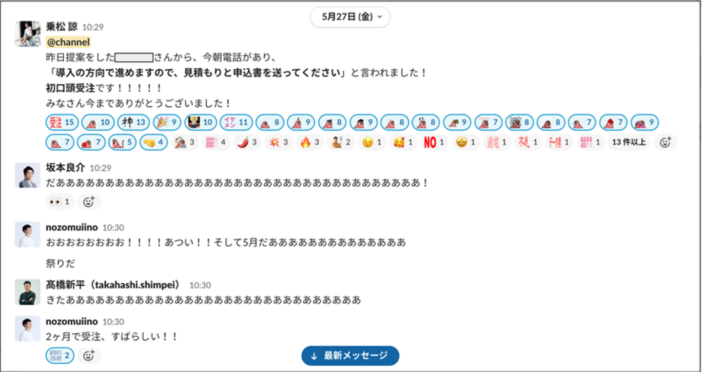 受注報告は全社に流れるようにしていますが、率先して役員陣が盛り上げるようにしています。メンバーからいきなりふざけるのはハードルが高いと思うので、役員や幹部陣から率先してふざけないと盛り上がらないので、とっても意図して盛り上げています。(本当はふざけたいだけかも…)