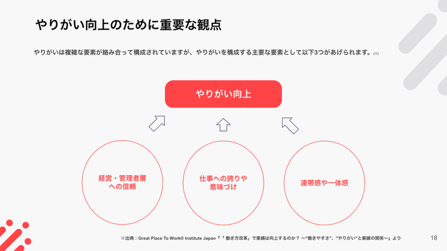 働きがいを高める方法についても自社で調査をしており、働きがい(やりがい)を高めるためには3つの要素が必要なようです。
