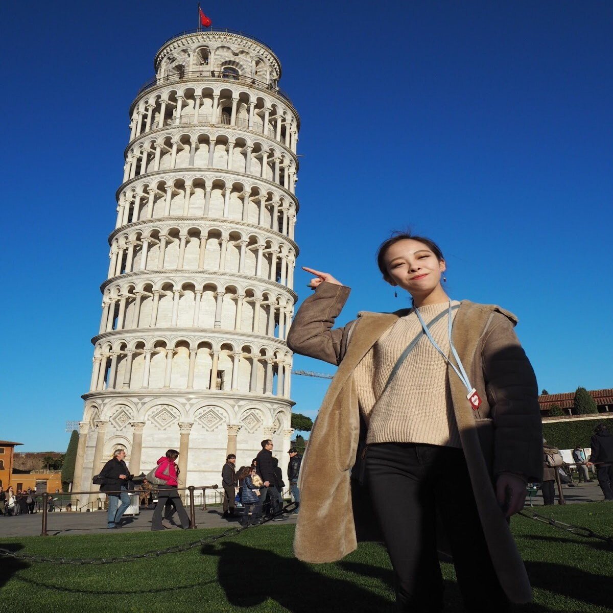 大学時代にはヨーロッパへ旅行に行きました。ピサの斜塔を支えているつもりです。