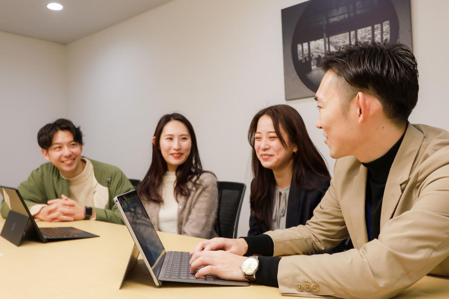 基本的には一人で商談にいきます。インターン生が取ってくれたアポイントはインターン生に同席してもらうこともあります。インターン生に帰属意識をもってもらったり、仕事に対するモチベーションにもしてもらいたいので。また、先方にとっても学生の生の意見を聞けるいい機会となると考えています。