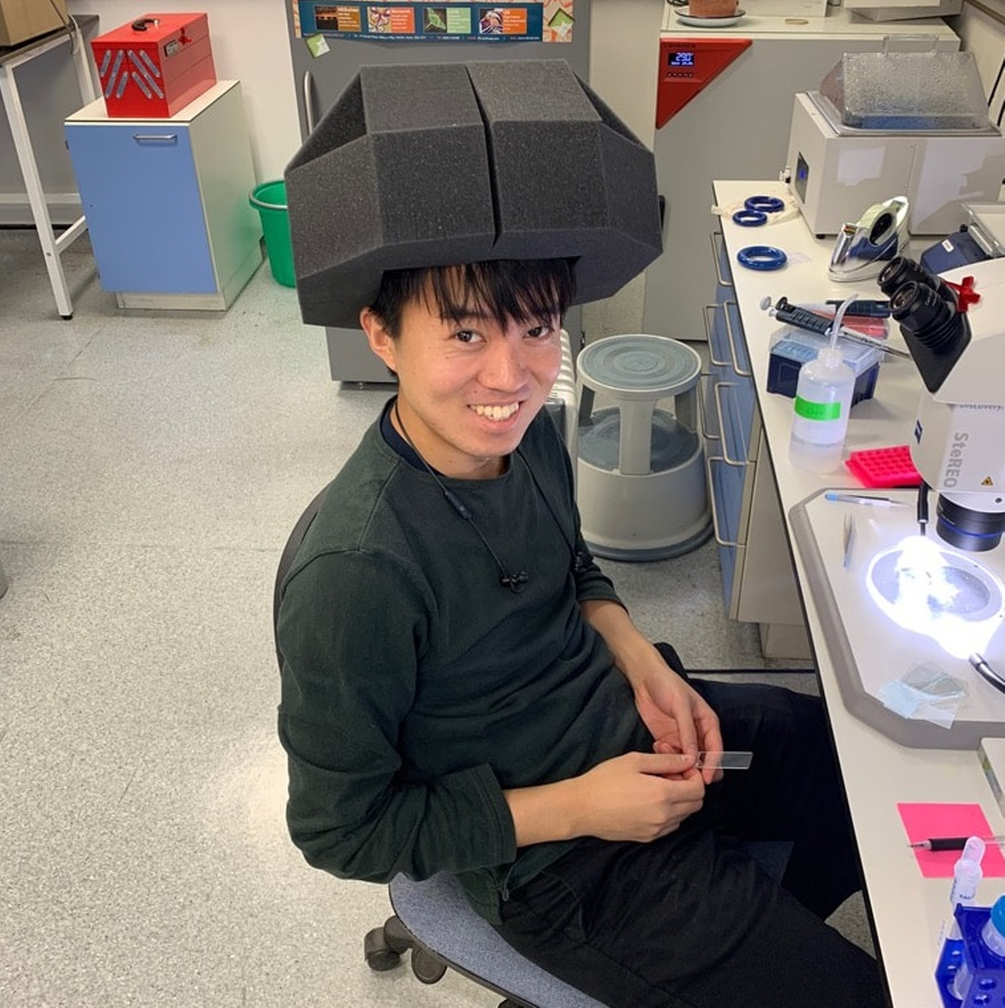 (大学院時代のラボにて。被っているのは二光子顕微鏡の梱包材)