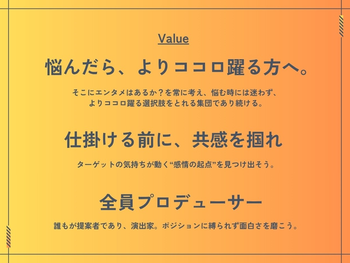 常にココロ躍る選択をする。ターゲットの気持ちが動く感情の起点を見つけて、そこから心動かす仕掛けを創る。全員がプロデューサーであり、誰もが探求者であり、演出家。ポジションに関わらず、共に最高のエンタメを作り上げる場所でありたい。