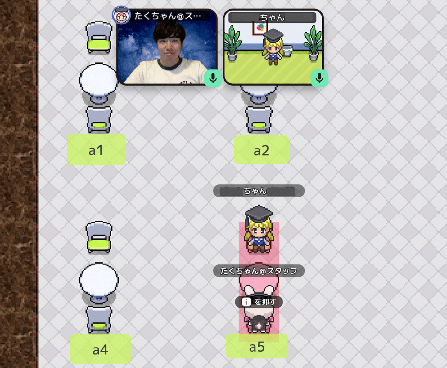 バーチャル空間のキャンパスでアバターとなって1on1をする様子。