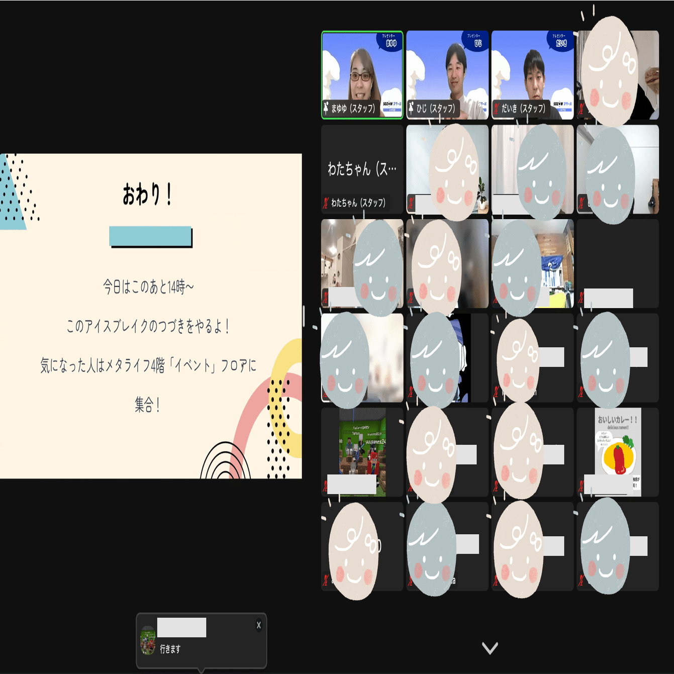 画面OFFでもOKで、みんなチャットで参加してくれます。