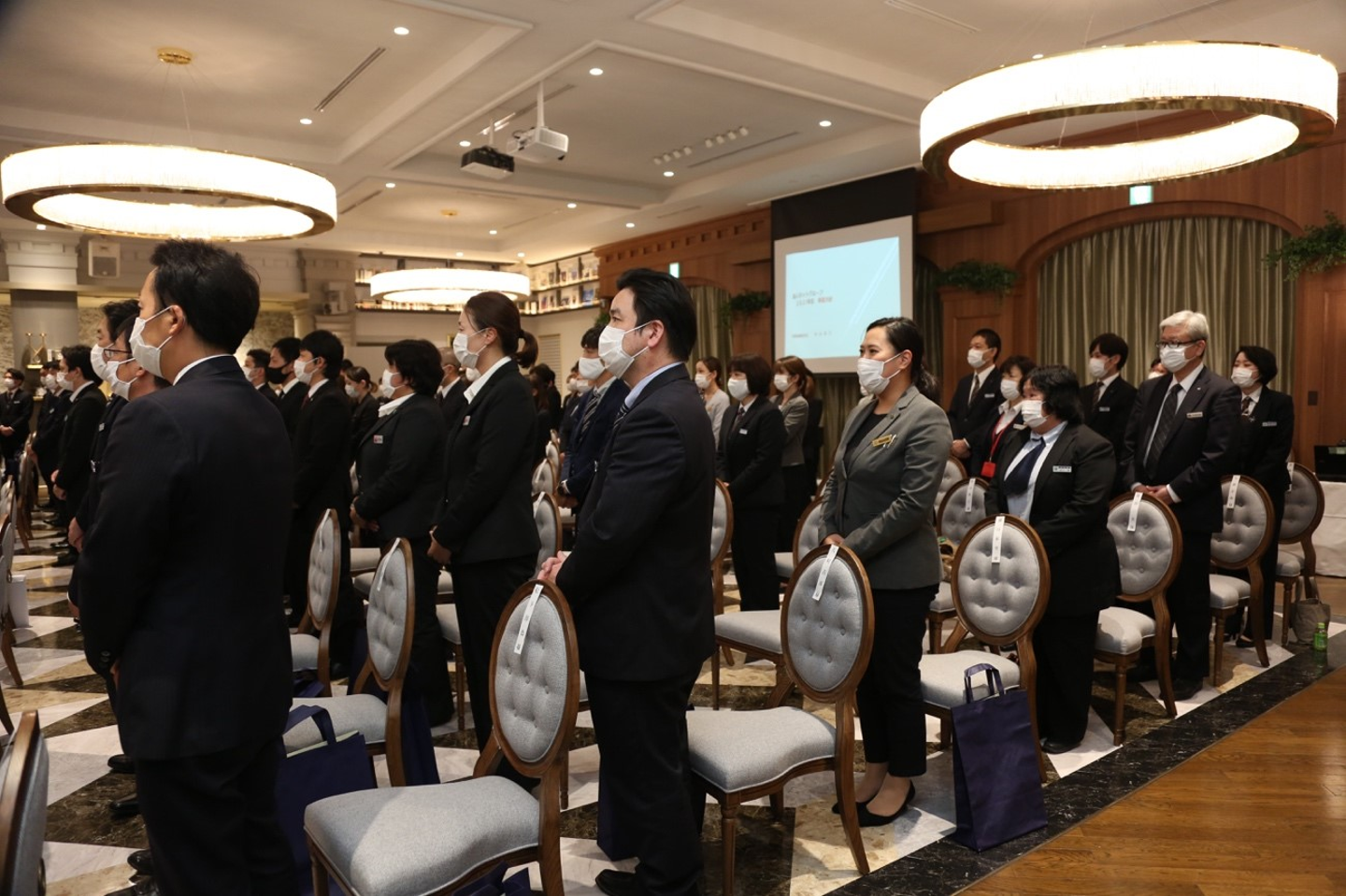 あいネットグループは、互助会をはじめ、ブライダル事業、フューネラル事業、介護事業、ホテル事業、飲食事業まで幅広く事業を展開しています。それ故に、事業や勤務地がバラバラな社員同士が接点をもつ機会を多く設けることができていないため、キックオフでは会長、社長から現場の社員まで全社員が同じ瞬間を共有し、グループ全体での理念・ビジョンの共有や、お互いの事業についての理解促進のための貴重な機会になります。
