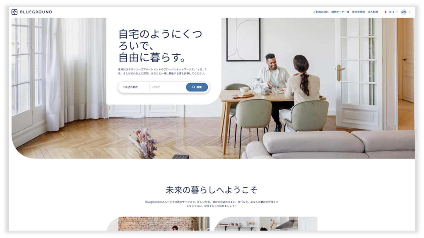 Blueground は、世界100都市・約20,000室を展開する、世界屈指のフレキシブルリビングブランドです。2023年12月にBlueground Japan 株式会社を設立し、現在はHmlet Japan 株式会社と連携しながら運営基盤を構築し、2030年には 全国10,000室規模を目指しています。