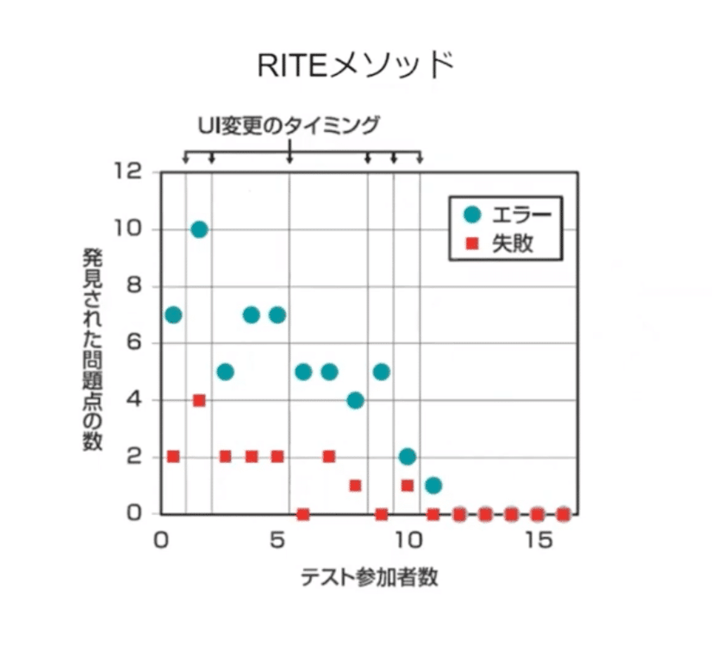 ↑1回目では失敗とエラーが多かったが、UI変更を細かく繰り返し、11〜16回で5人連続でエラーと失敗がなくなっている。[引用:UXリサーチの道具箱II ]