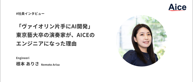こんにちは!AICEの採用担当です!AICEのメンバーインタビュー記事もおかげさまで第5弾に突入しました!AICEのメンバーは多彩な才能を持ったメンバーたちが多く働いています。その中でも今回は、ヴァイオリンの演奏家として活動をしながらAICEでAIエンジニアとしても大活躍の、ひときわ目立った経歴の持ち主、根本さんのインタビューです!全く異なるジャンルでの二足の草鞋を履く根本さんに、AICEでの日々の働き方や今後のビジョンなどをたっぷり語っていただきました!自己紹介業務内容働き方メッセージ自己紹介―――まずは簡単に自己紹介をお願いします。東京藝術大学卒業後に渡英し、現在も演奏家として活動を...
