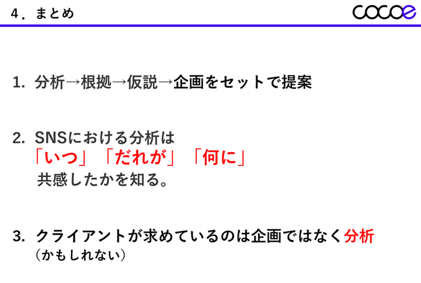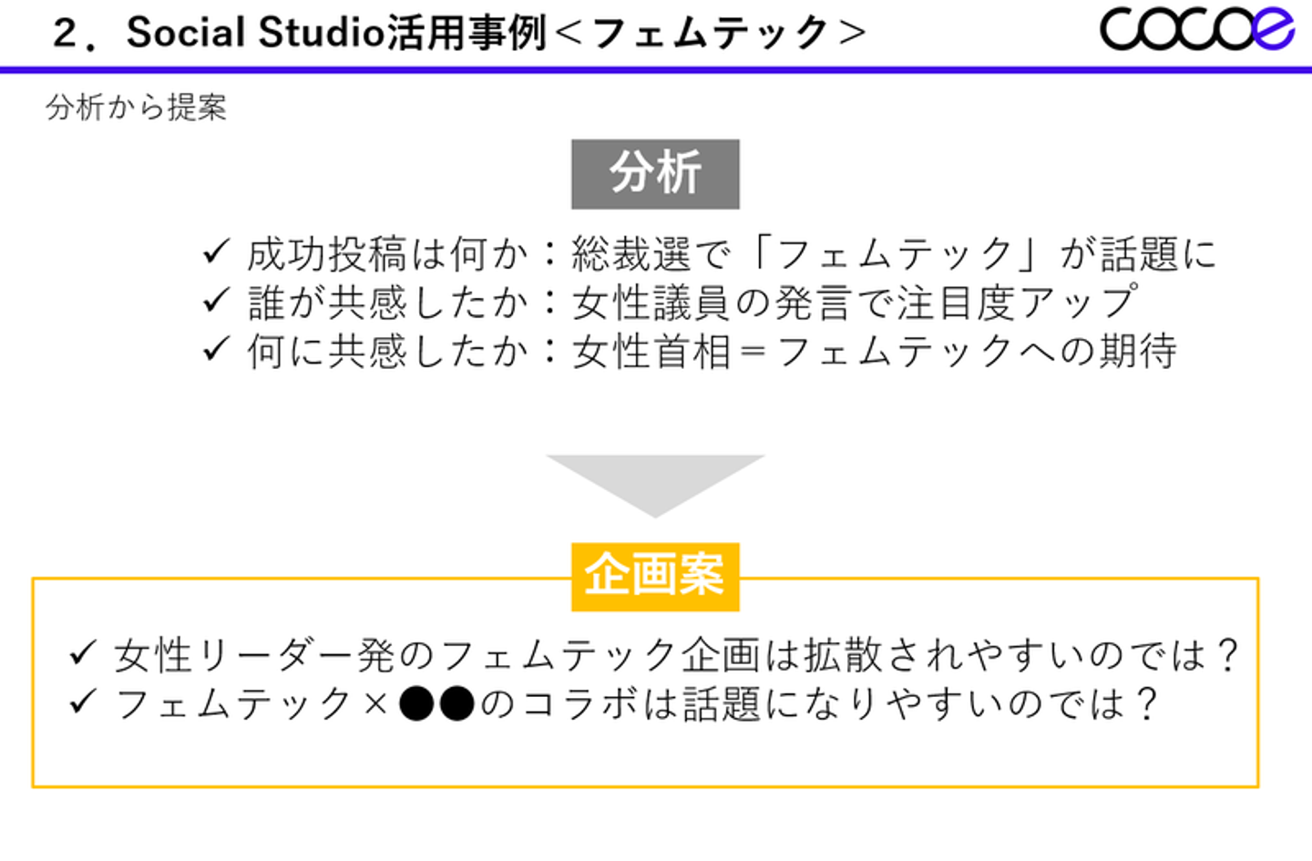 ココエのクライアントやサービス、業界のキーワードから分析、分析を基にした仮説→企画に落とし込みます。