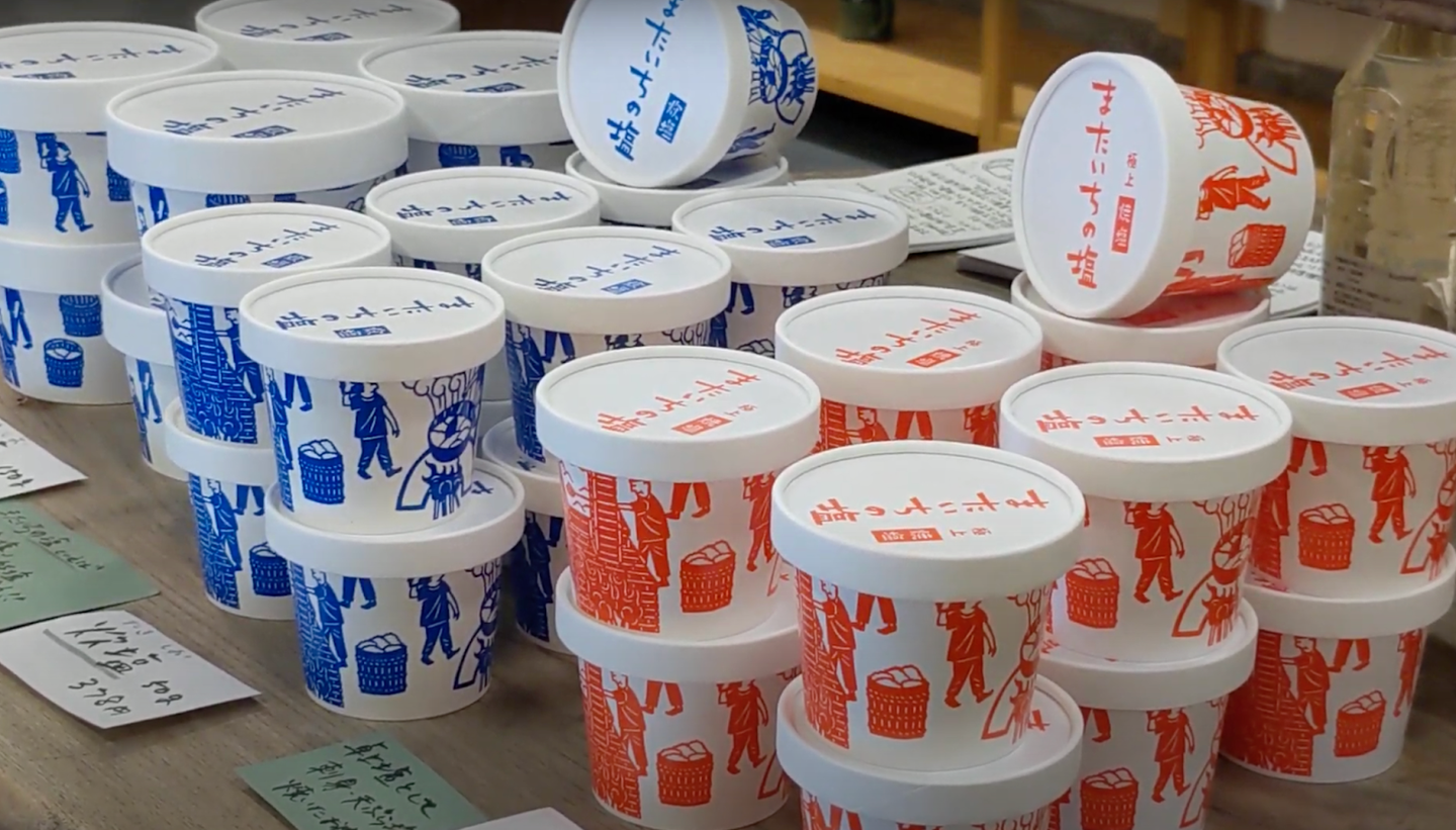 万野さん:実は、新三郎商店の主力商品である「またいちの塩」のパッケージデザインを手がけました。塩のパッケージといえば、よくイメージされるのがビニールの袋に入ったものだと思います。しかし、会社として環境問題に取り組む意識がある中でビニールに頼るのは良くないと思い、アイスクリームを入れる紙パックに目を付けました。紙パックの業者の方からは、「この容器に塩を入れた人は初めて見た」と言われました(笑)