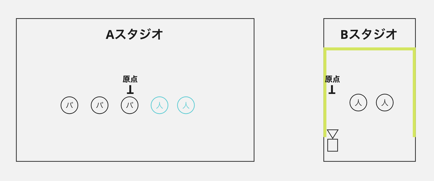 原点と呼ばれる自由に設定できる基準点を各スタジオに置いてそこからの位置関係で合成ができるので、お互いの位置関係もわかりやすく、スペースに応じて柔軟な撮影が可能です。
