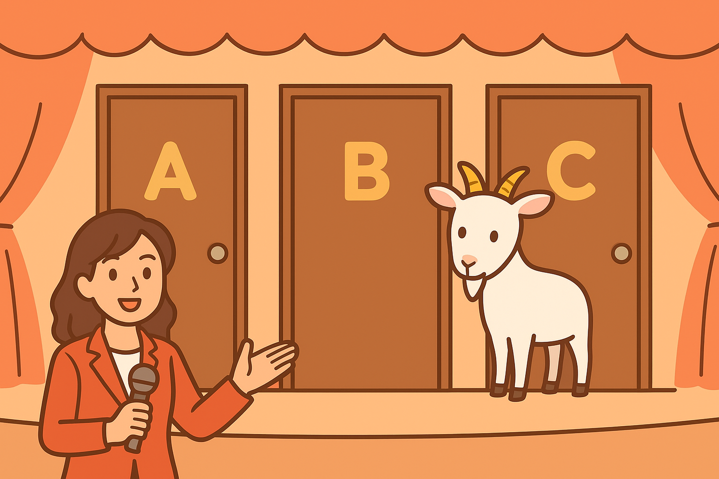 ドアの1つの裏には「当たりの車」、残りの2つのドアには「ハズレのヤギ」が隠れている。