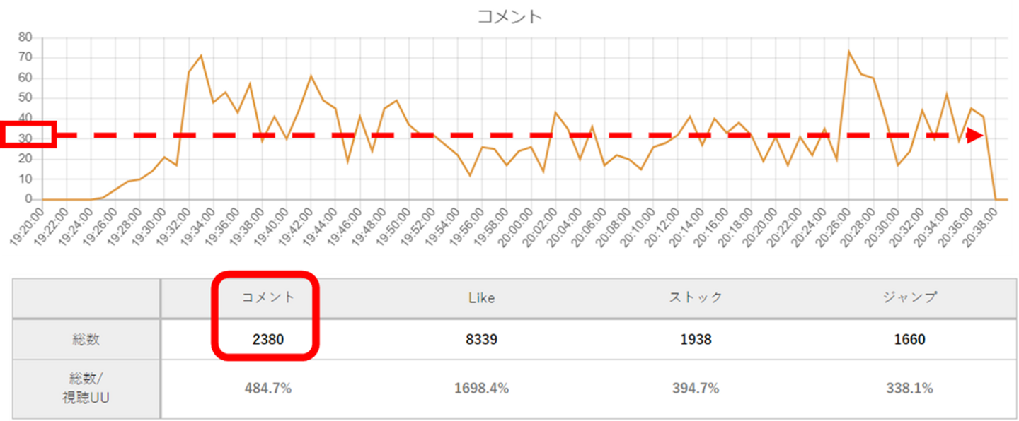 ここまでご紹介したような機能を使い、視聴者が主体の接客型のライブコマースを行いました。その結果本配信は、コメント数2380件、1分間に30件以上のコメントが投稿され続ける、視聴者の主体性の高いライブコマースとなりました。