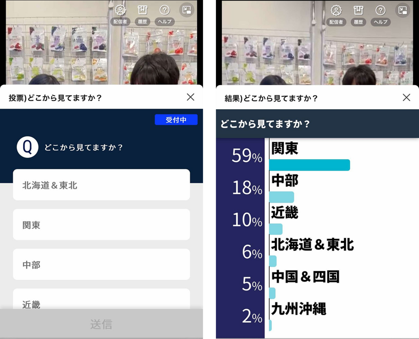 視聴者にアンケートを行うことができ、結果を踏まえた商品紹介に繋げることができます。今回は視聴している地域のアンケートで、多かった地域に合った商品の紹介を行いました。