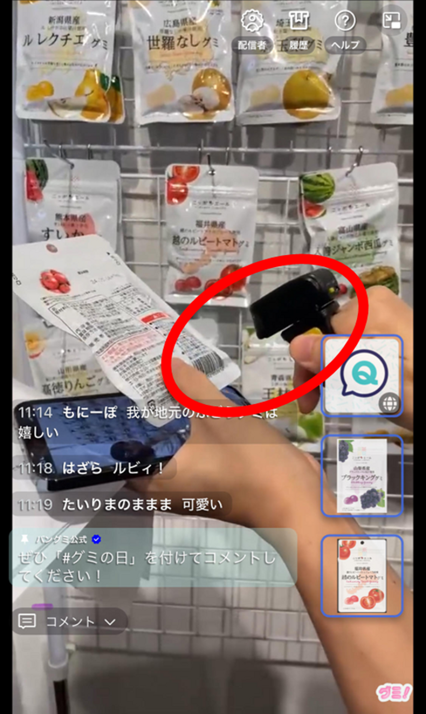 視聴者のコメントを受けてコメントに紐づく商品を紹介します。コマーサーはバーコードリーダーを使い商品のバーコードを読み取ることで、リアルタイムで商品の呼び出しが可能です。視聴者が商品に出会う中で興味を持ったものに繋げることができます。