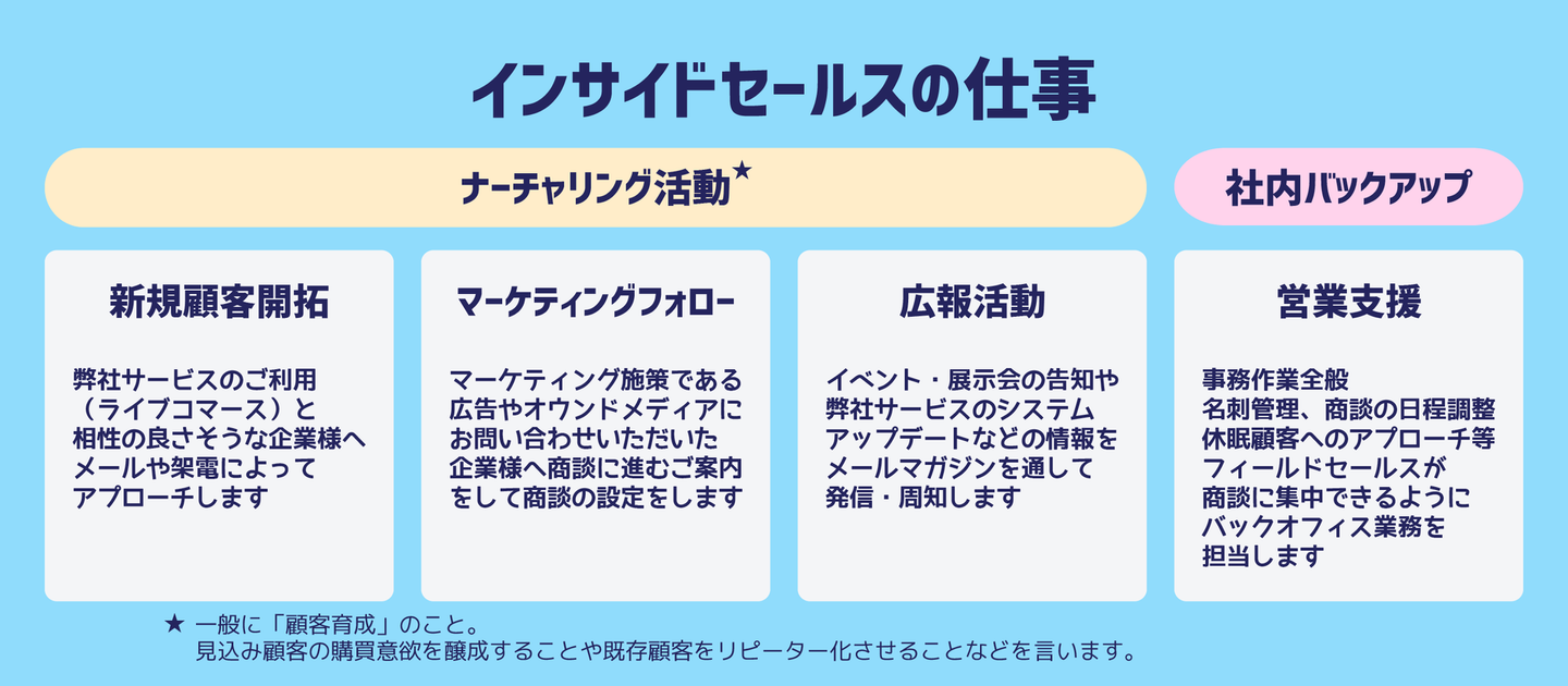 新規開拓やマーケティング施策によって集まった企業へその段階に合わせたアプローチをし、商談に進めるためにメールや架電でコミュニケーションを取っていく仕事。コミュニケーションにはイベントやシステムに関連するお知らせのメールマガジン発信もある。